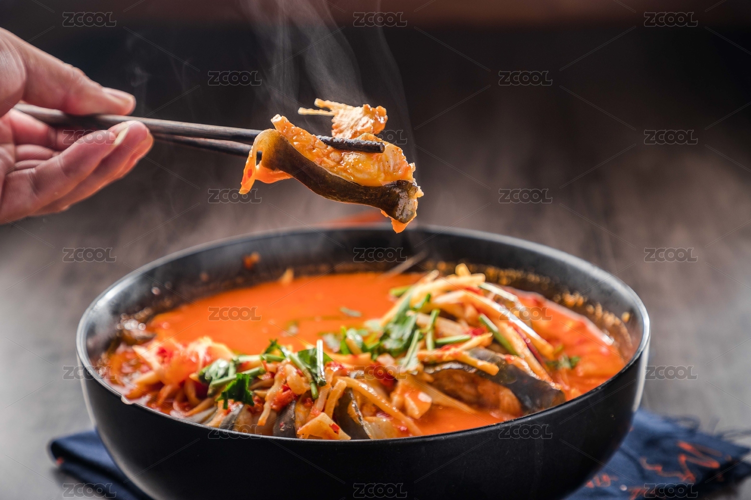 藍(lán)色餐布上的一盆云南酸湯魚(yú)