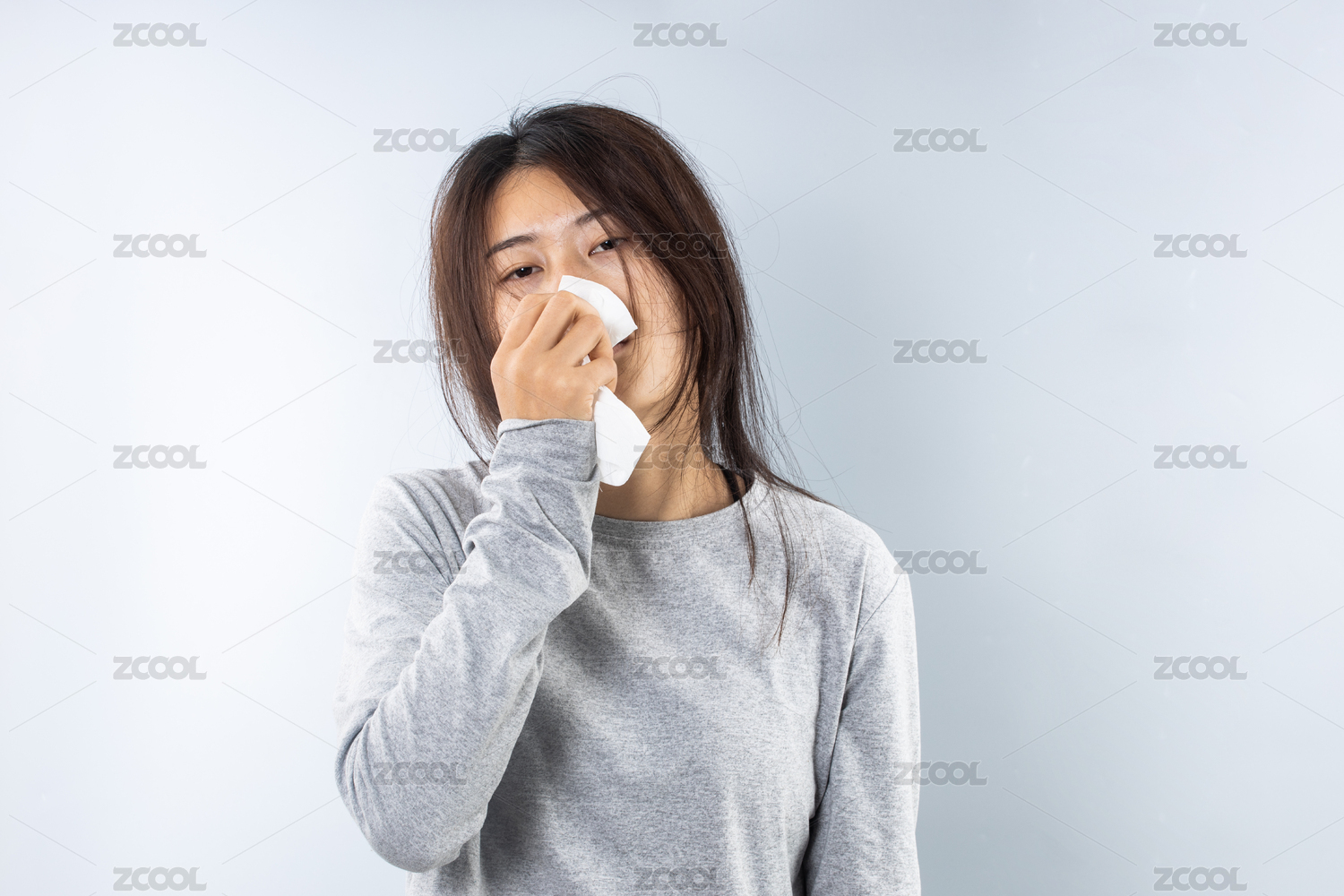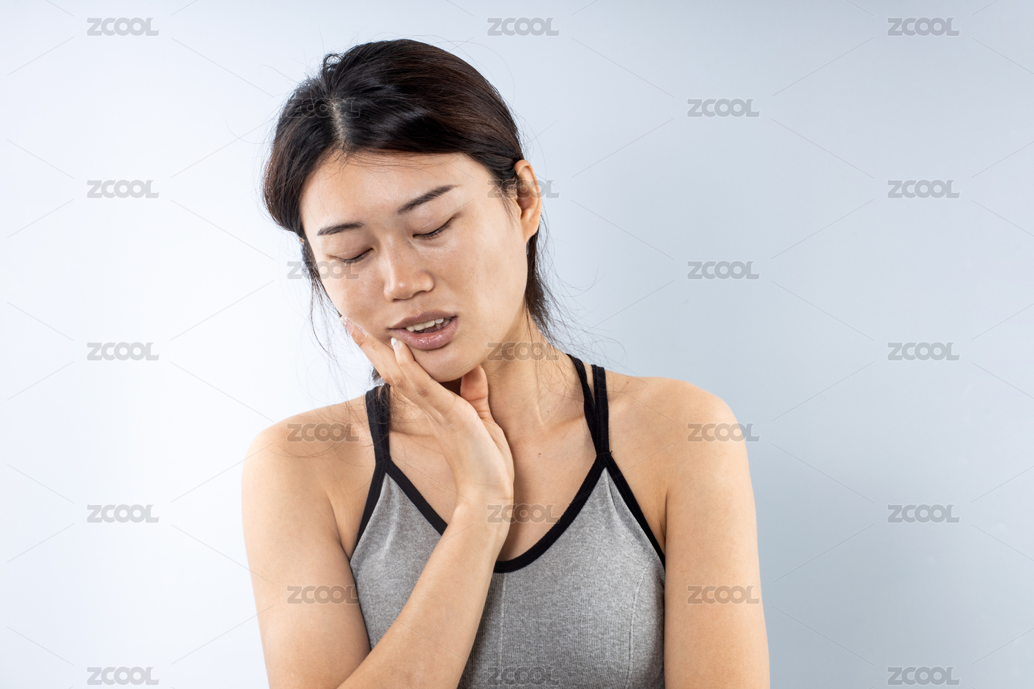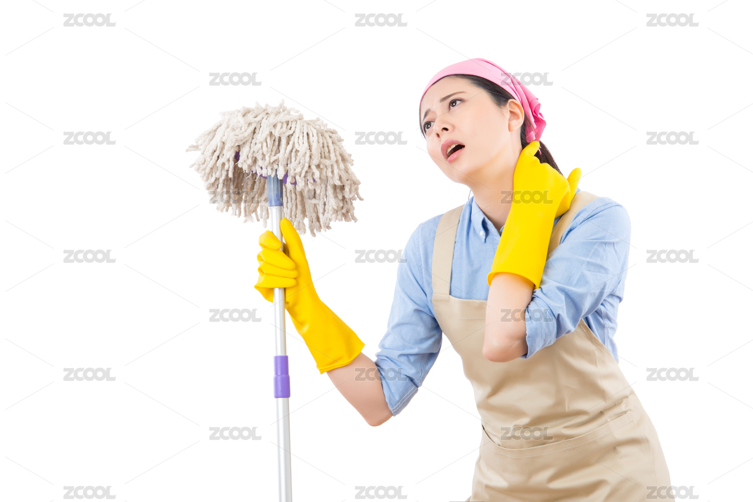 年輕人有吸引力的家庭主婦做大掃除覺得累了,疲倦之后,從頸部疼痛困擾。隔絕在白色背景。家務(wù)勞動和家庭保健理念。
