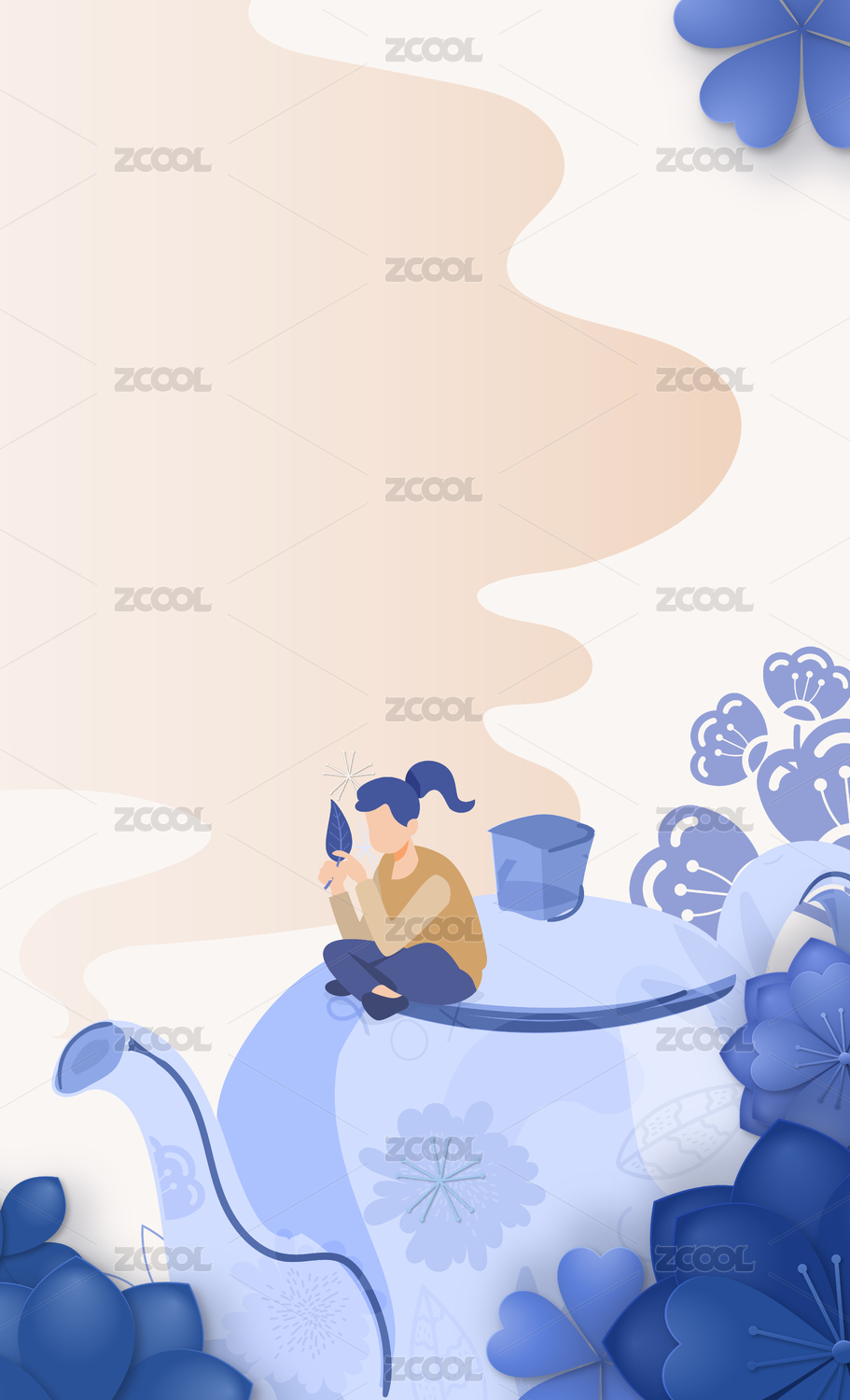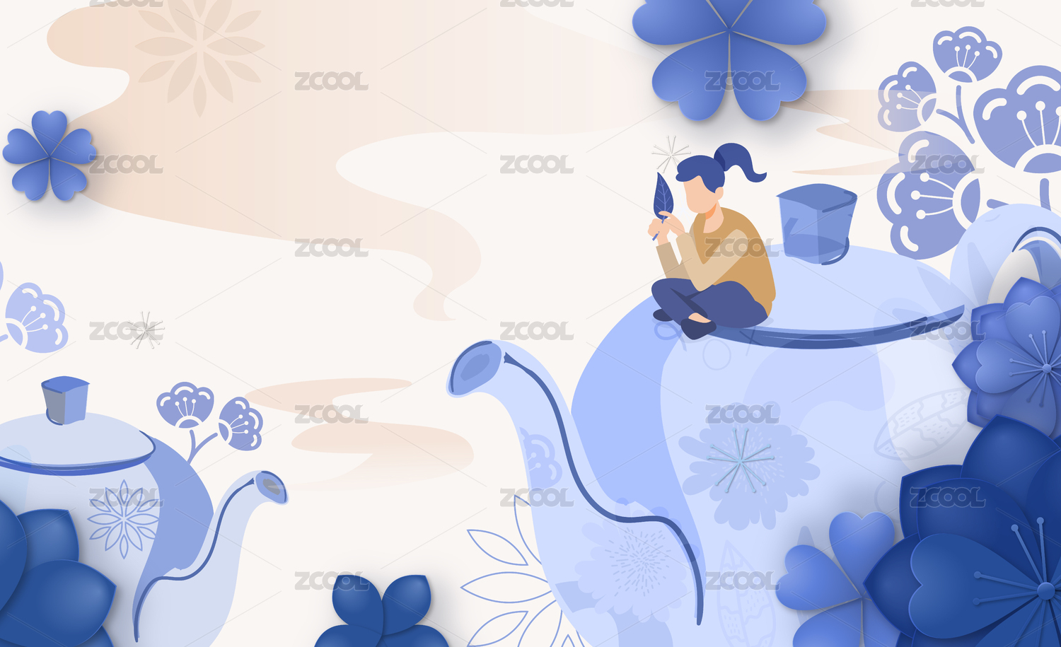 卡通青花瓷中國風(fēng)茶道茶葉包裝淡雅背景矢量插畫