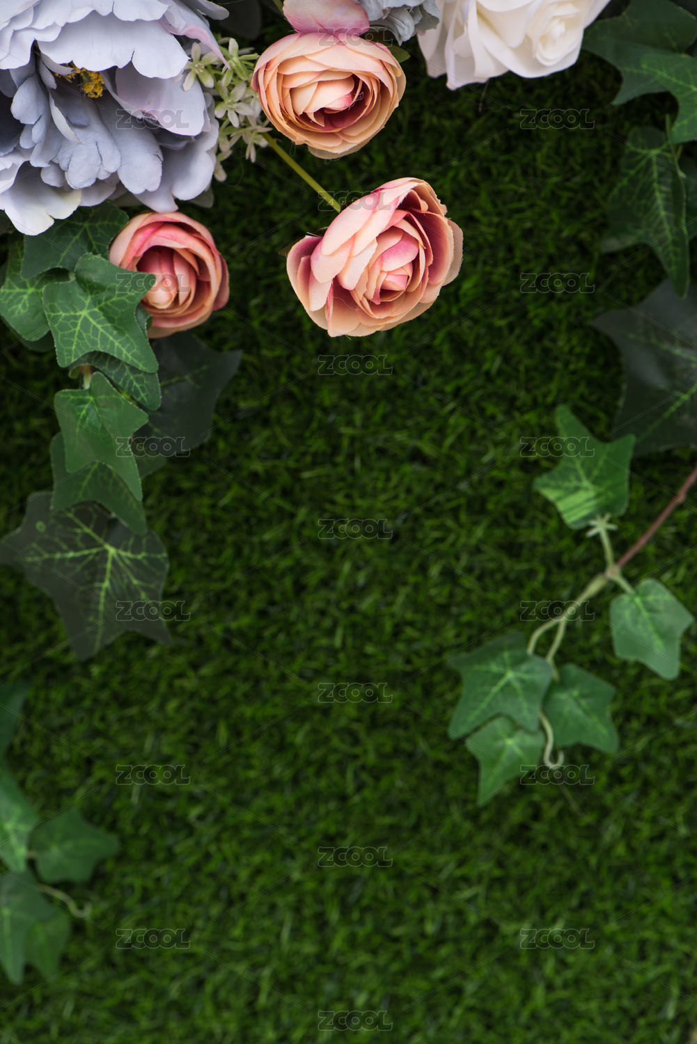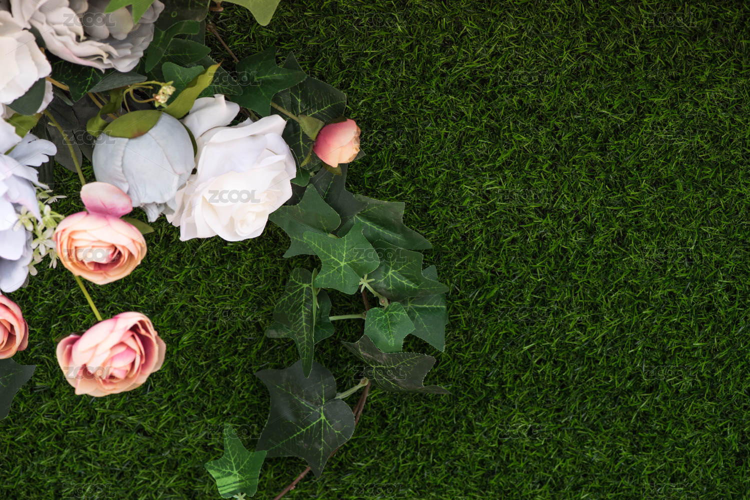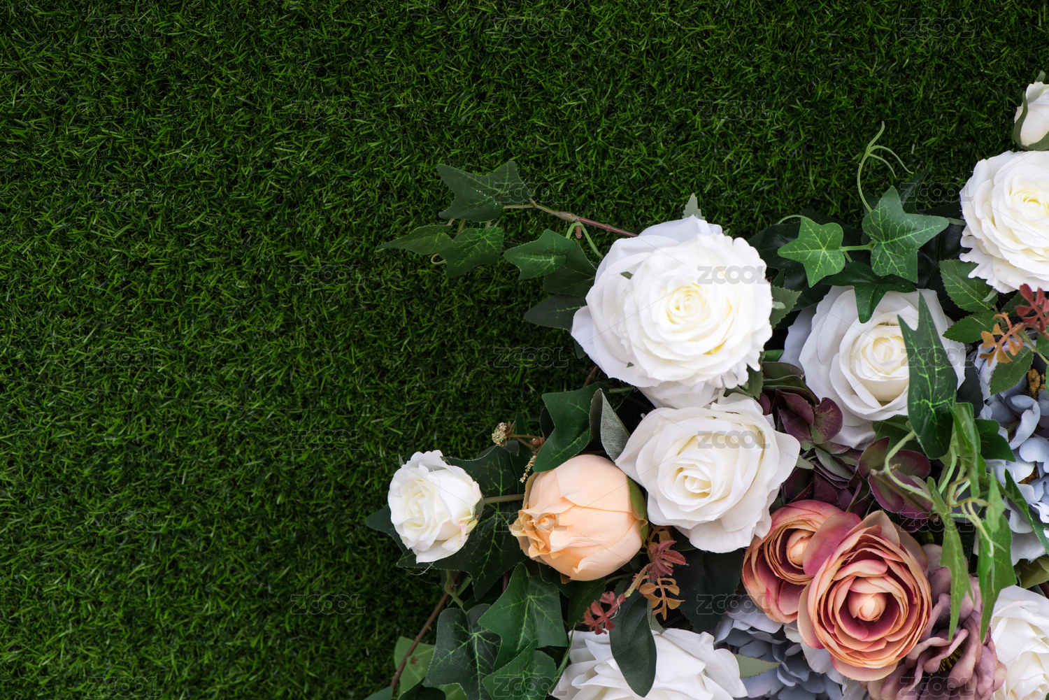 多種顏色的仿真玫瑰和綠色仿真草坪
