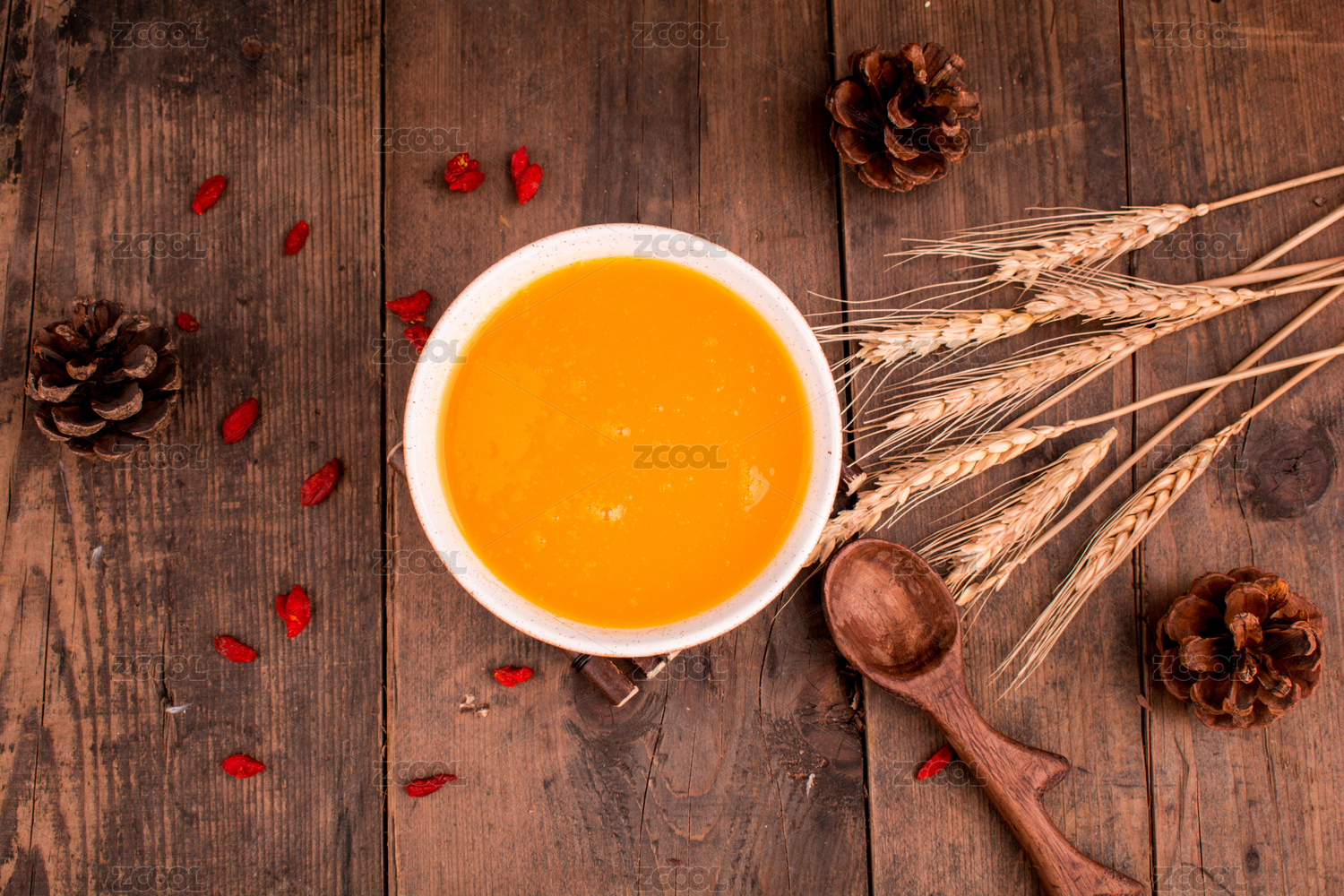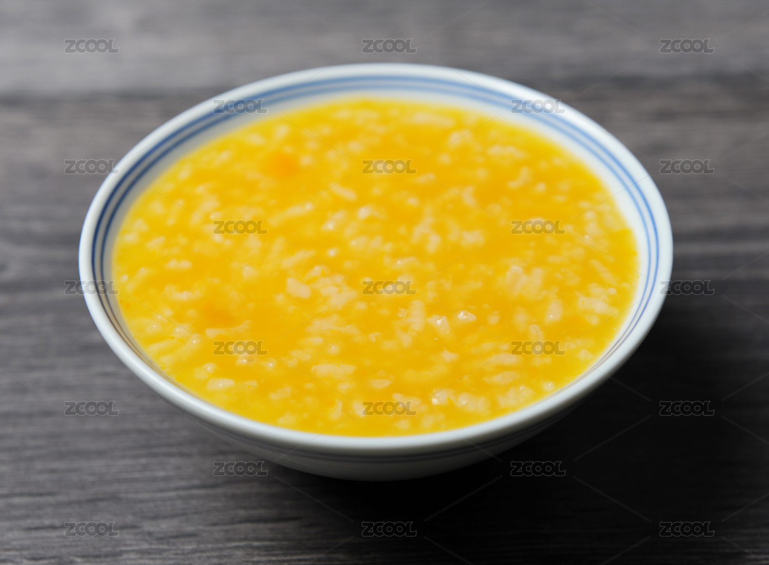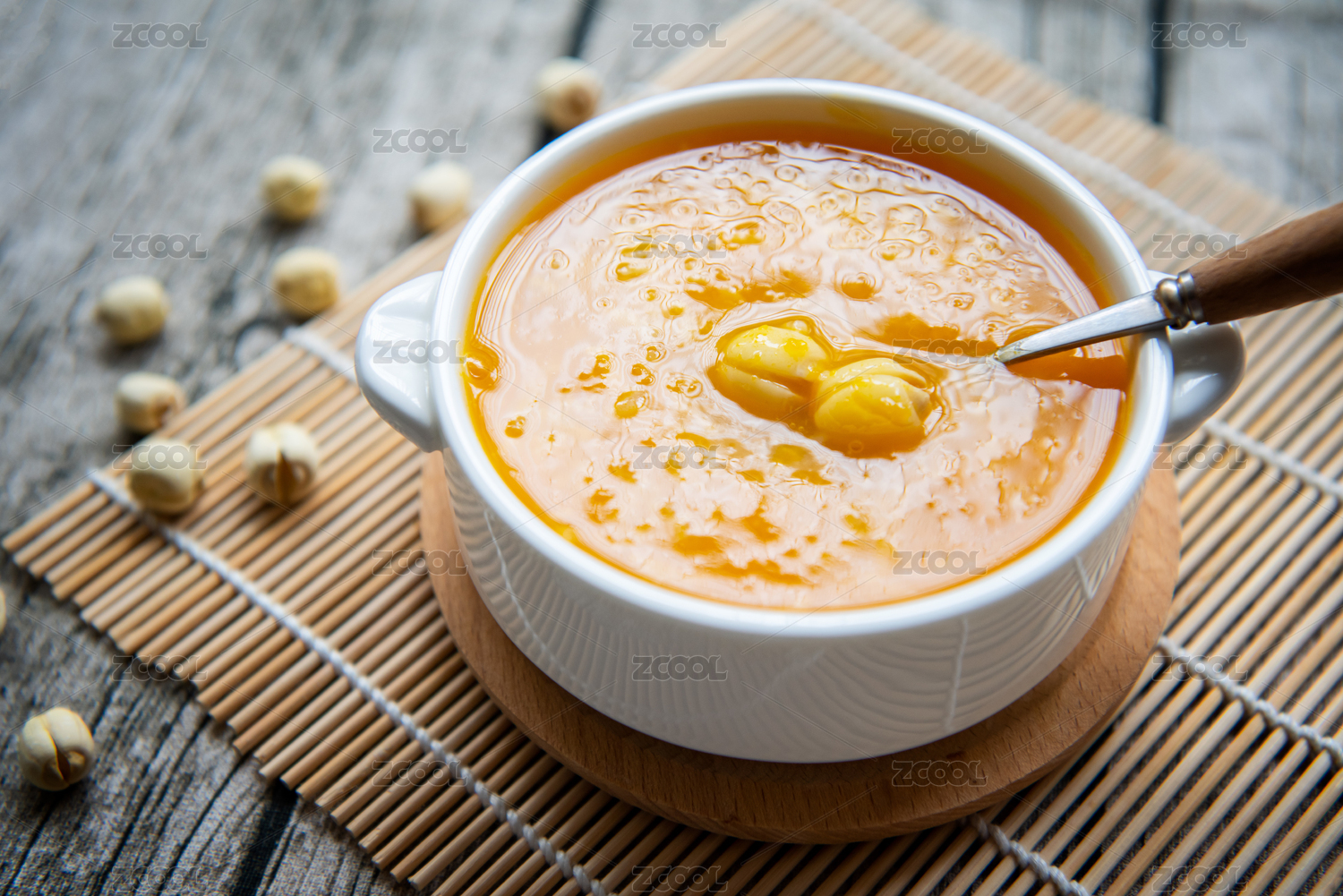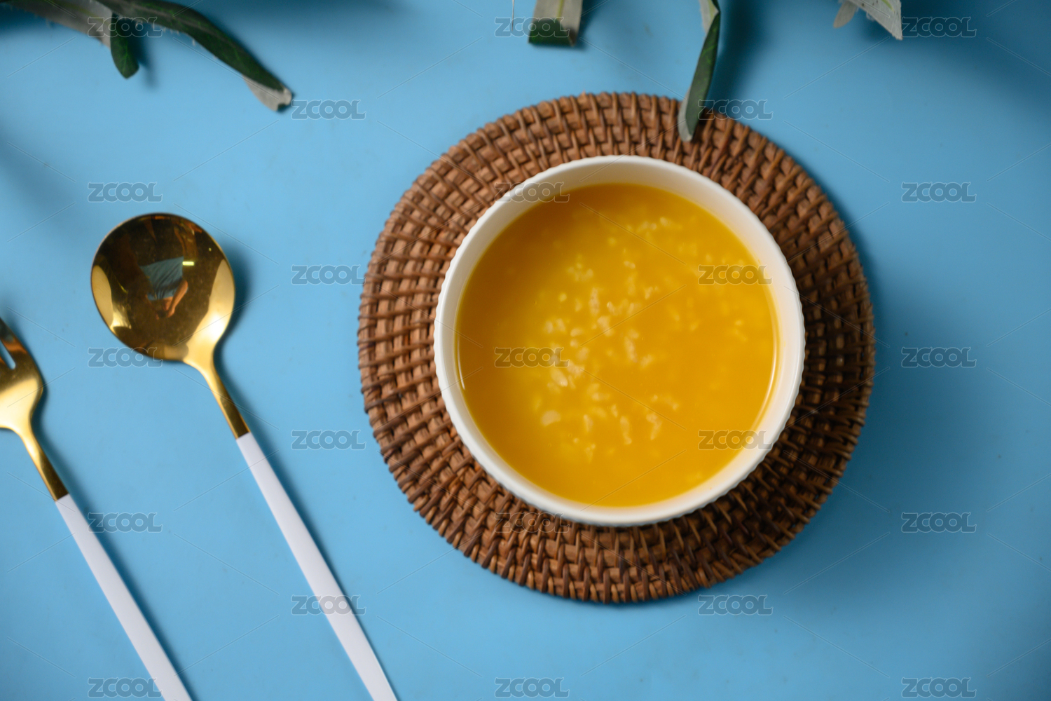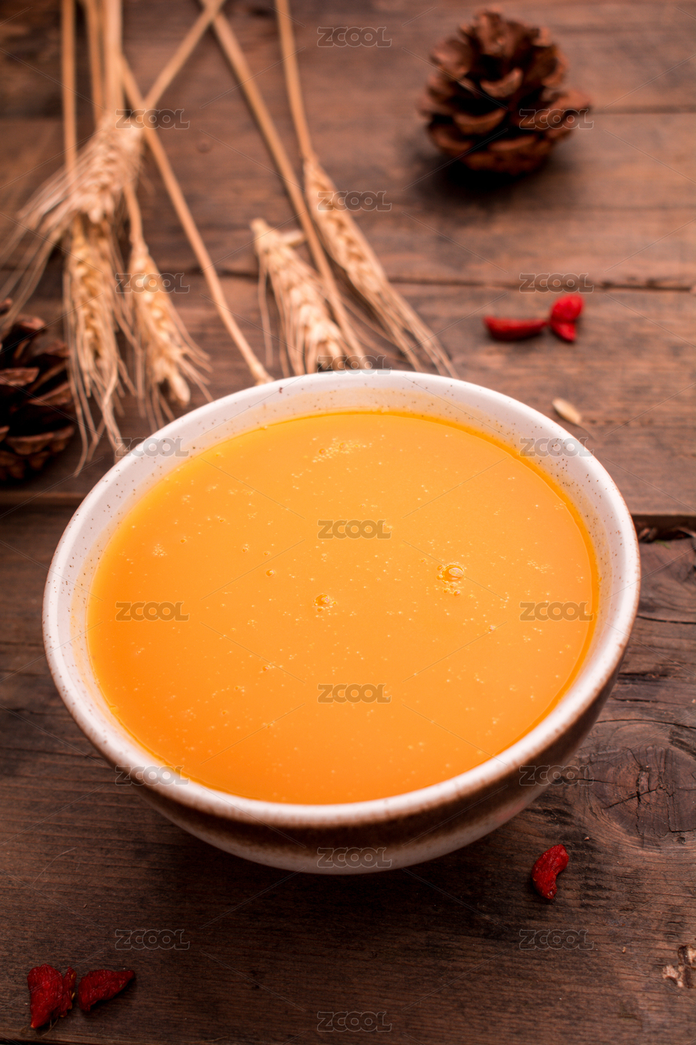 復(fù)古木桌上的一碗金黃色的南瓜粥