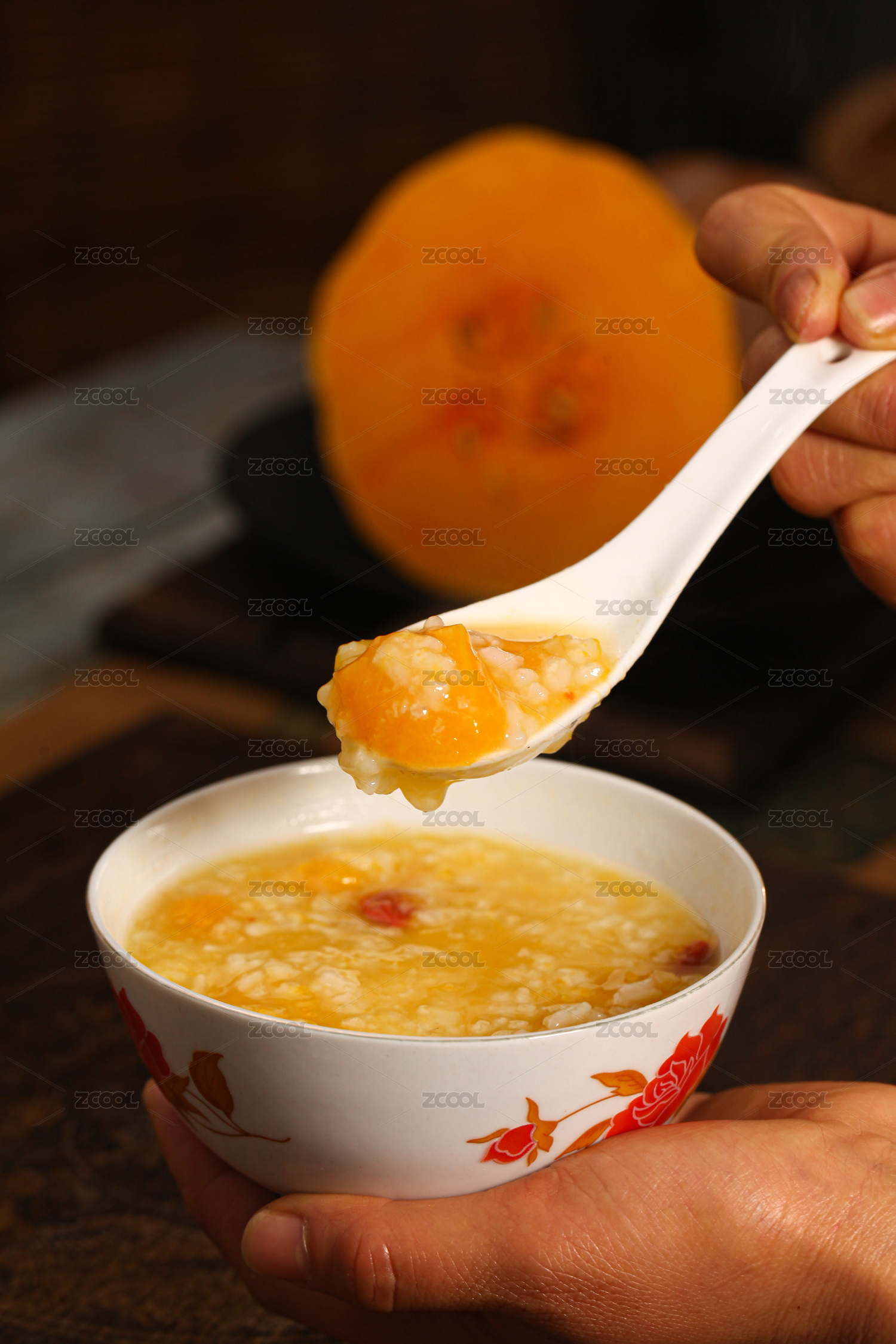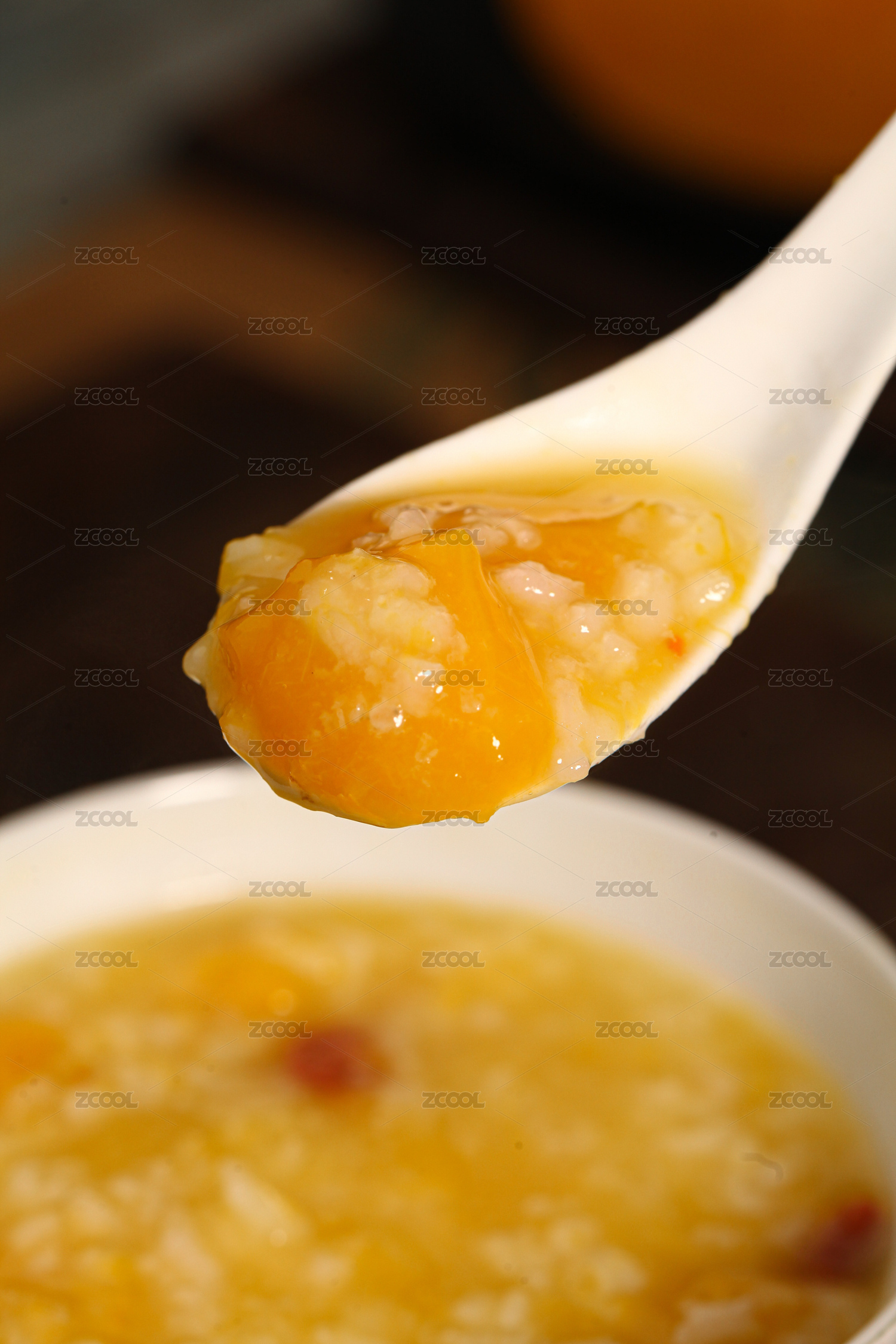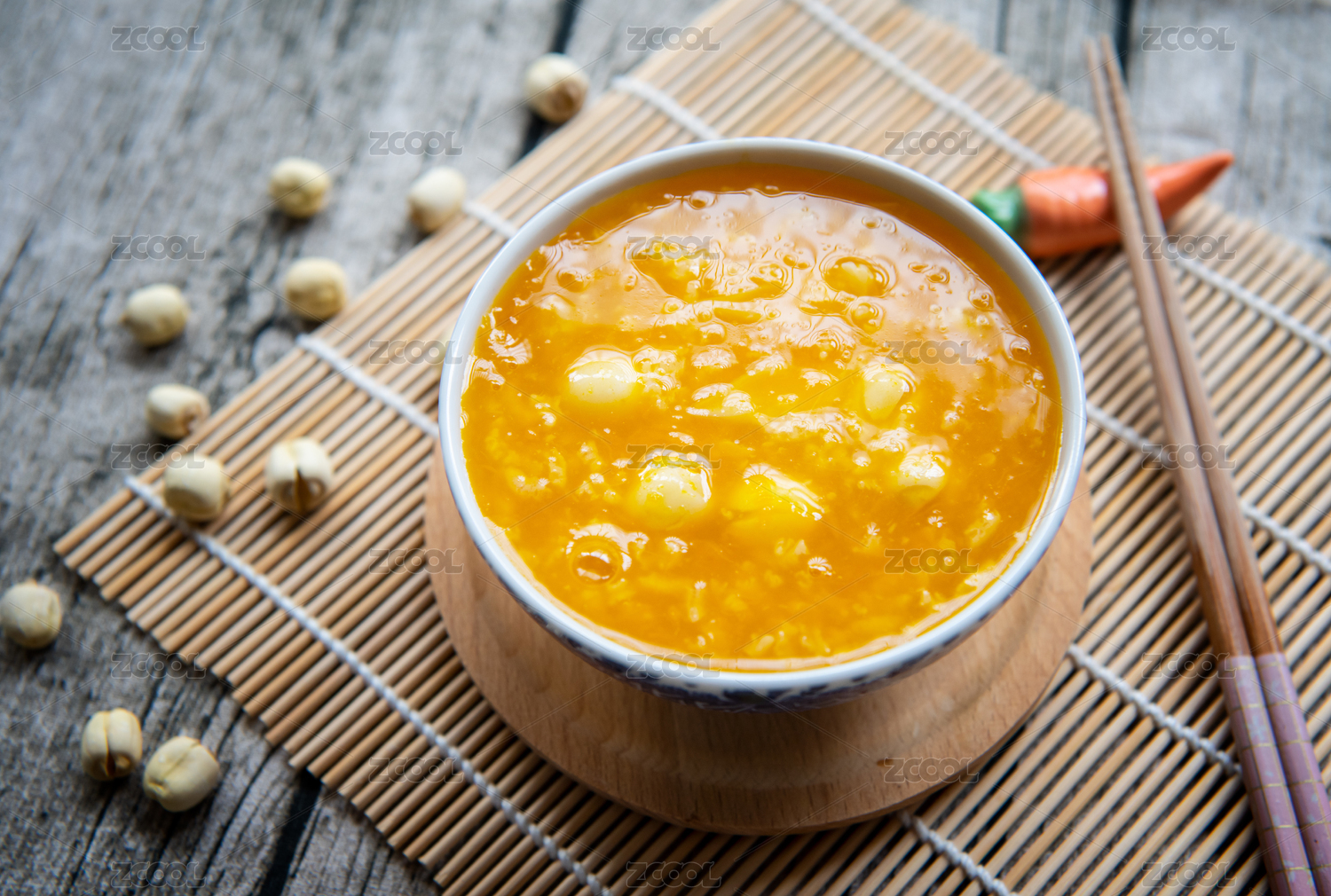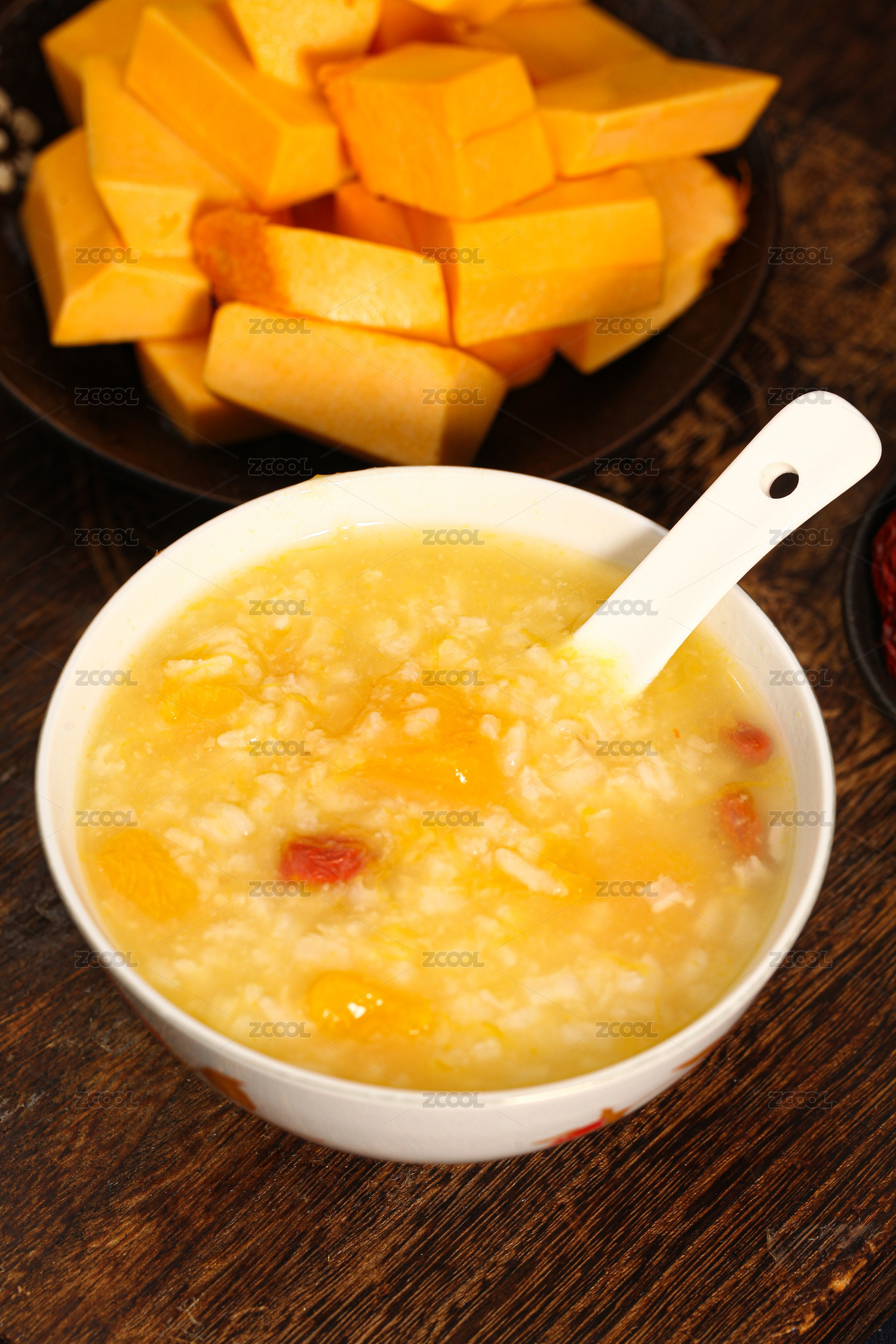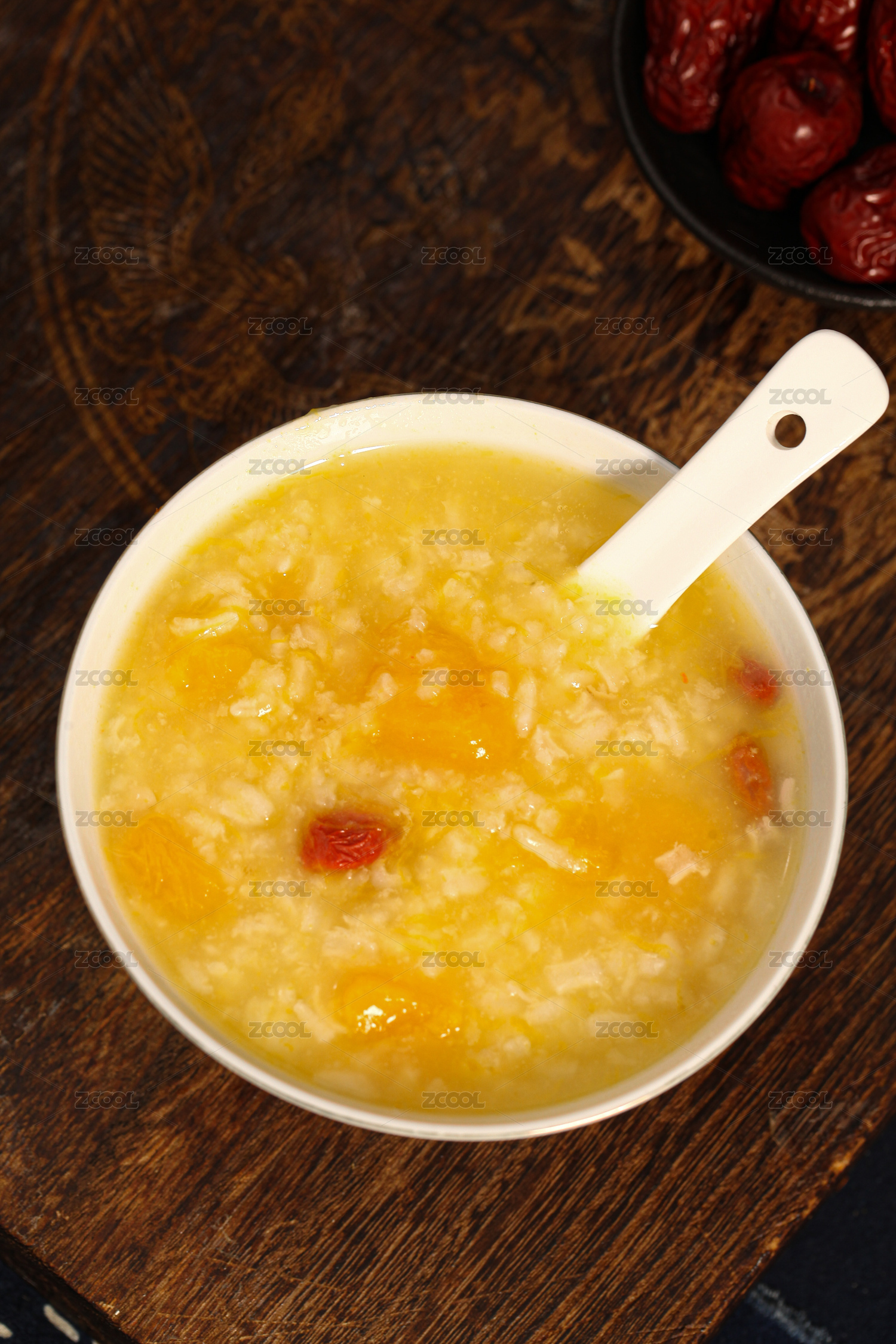 復(fù)古木桌上的一碗金黃色的南瓜粥