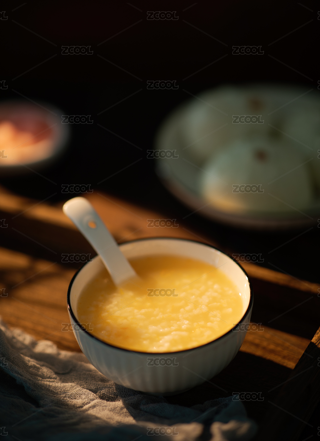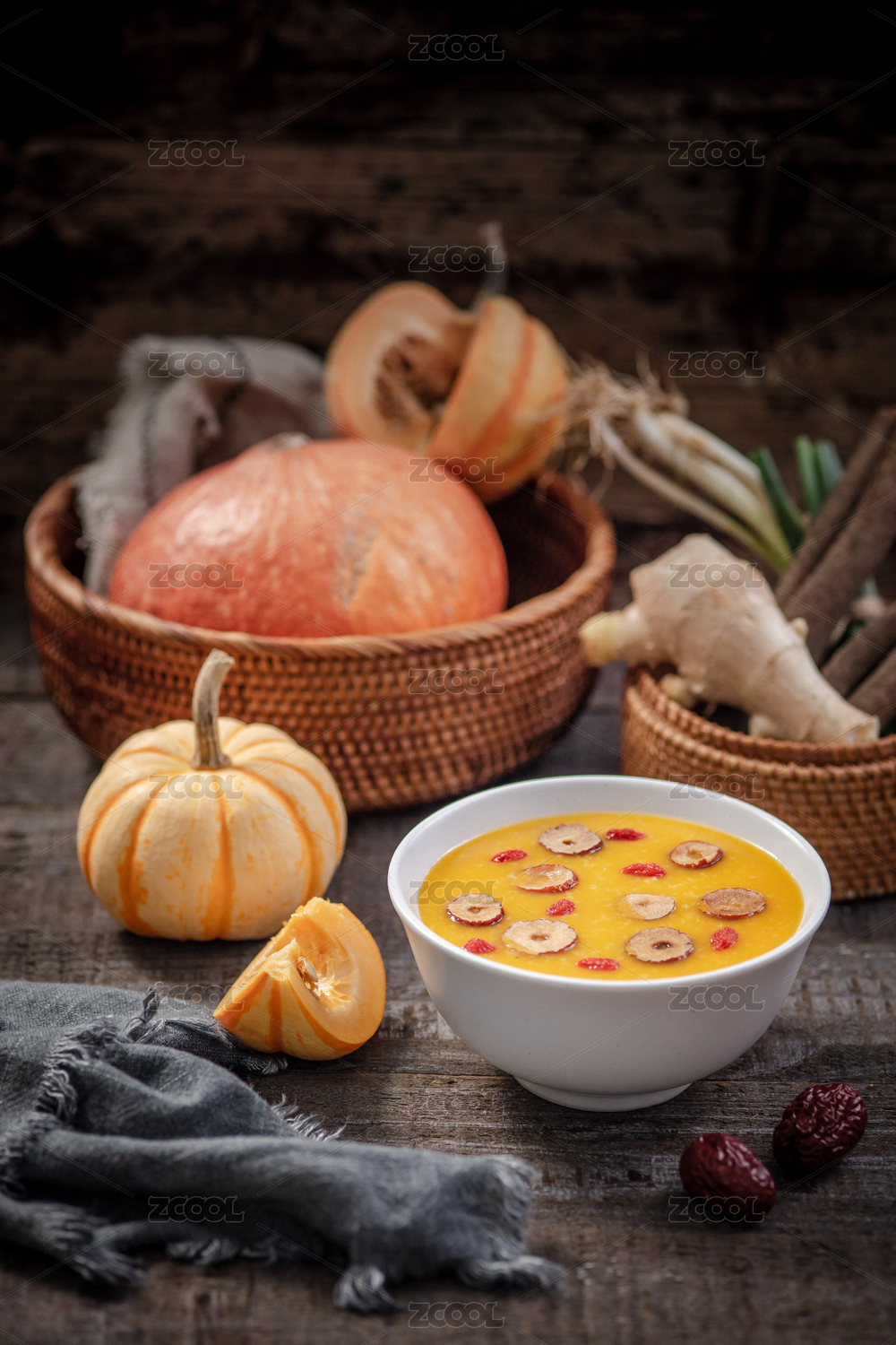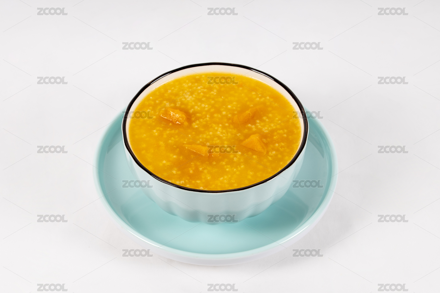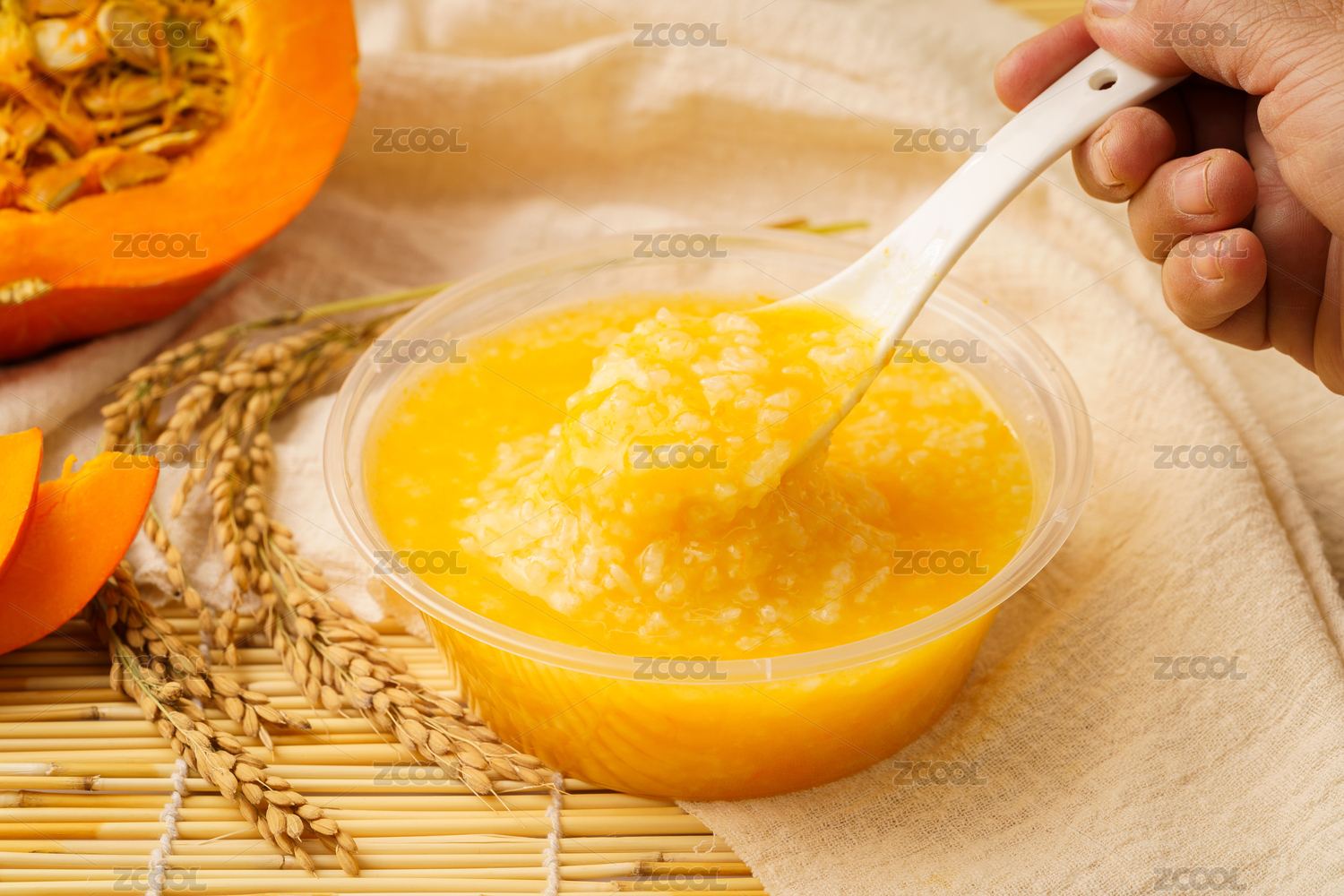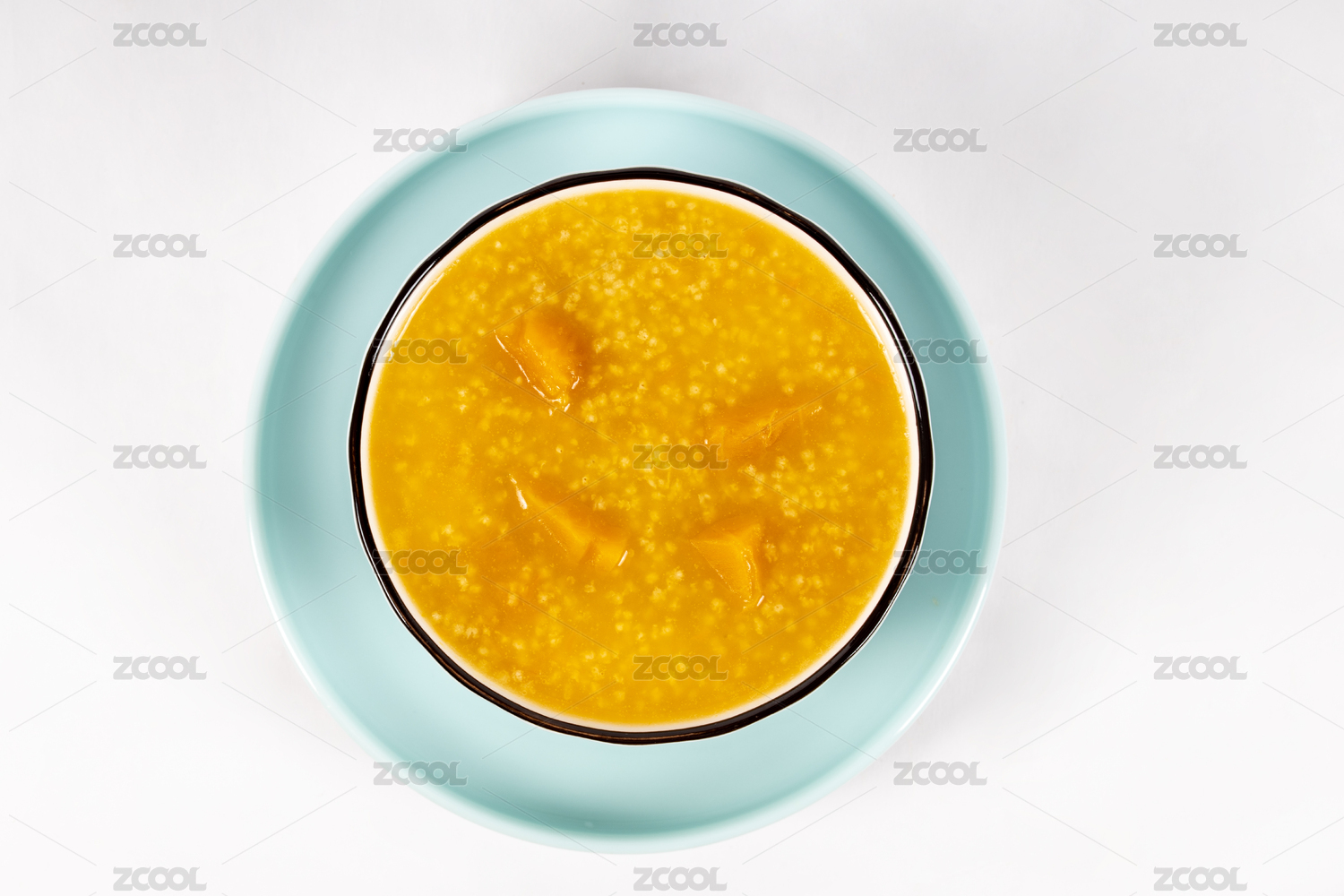 復(fù)古木桌上的一碗金黃色的南瓜粥