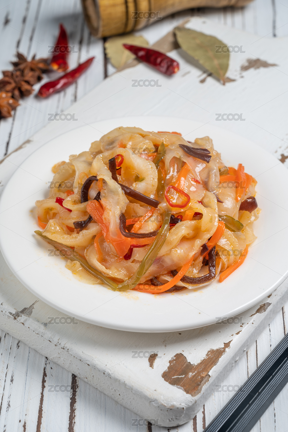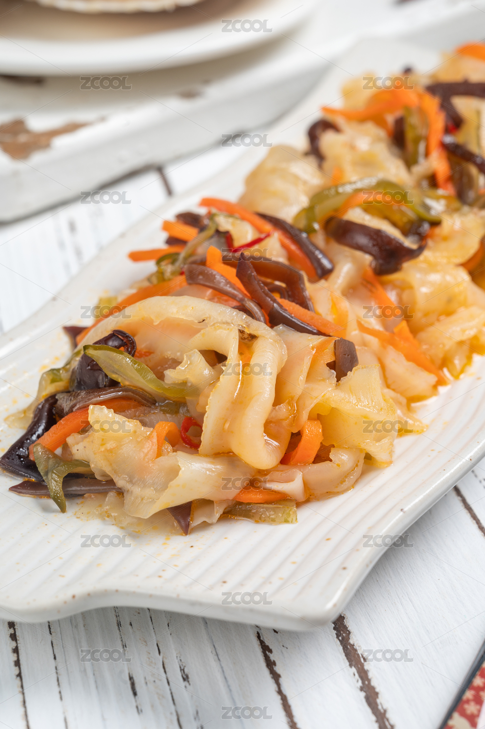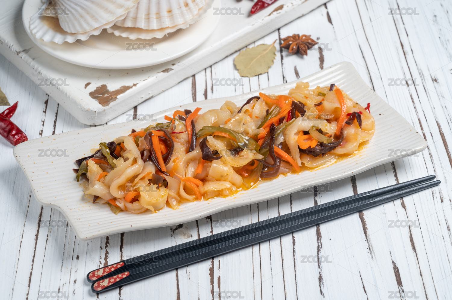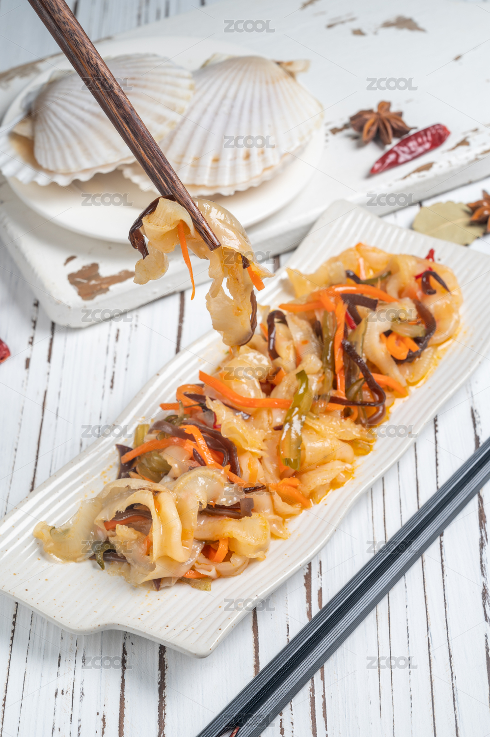 白盤里的麻辣扇貝肉