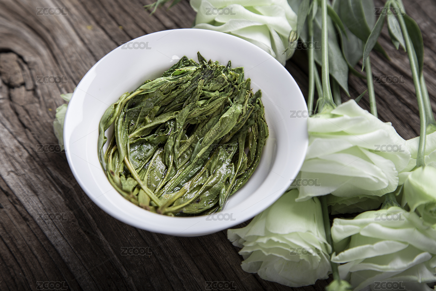 木制桌子上的德化白瓷蓋碗里面放著太平猴魁葉底,旁邊放著綠色桔梗鮮花