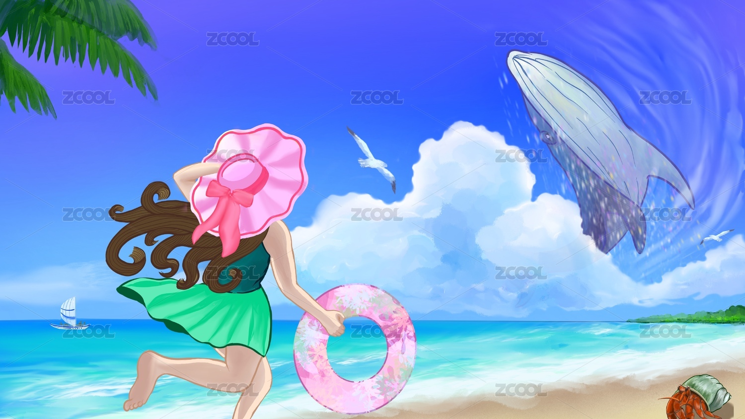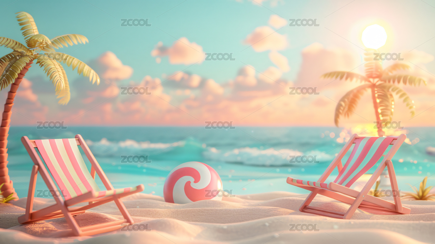 夏日清新度假風(fēng)3D插畫(huà)夏天海灘度假