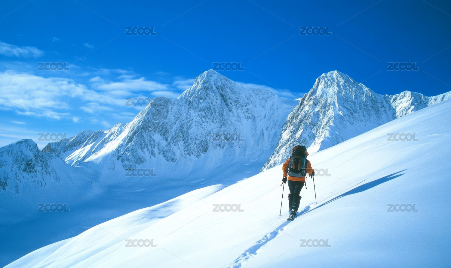 一位登山者在雪山上徒步前行的場景