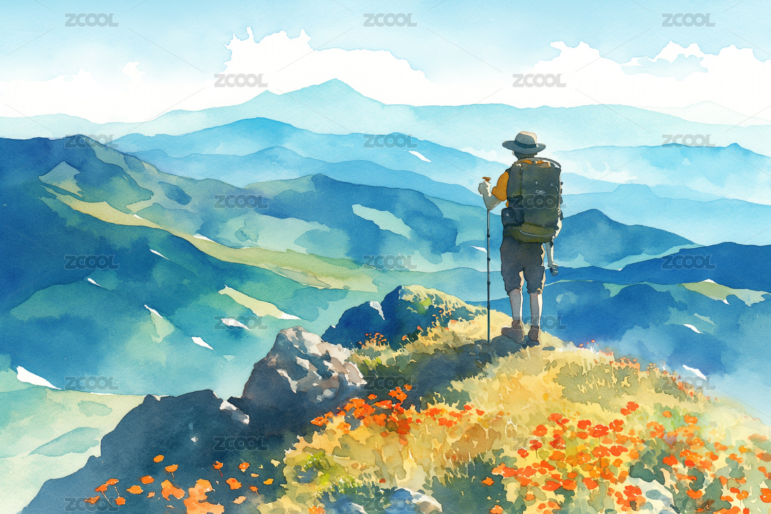 一個背包客獨自爬山登山水彩插畫