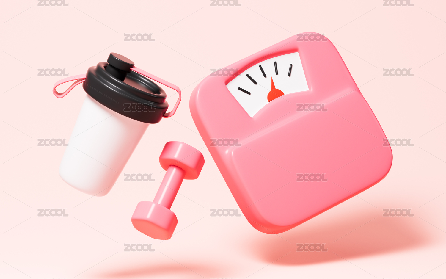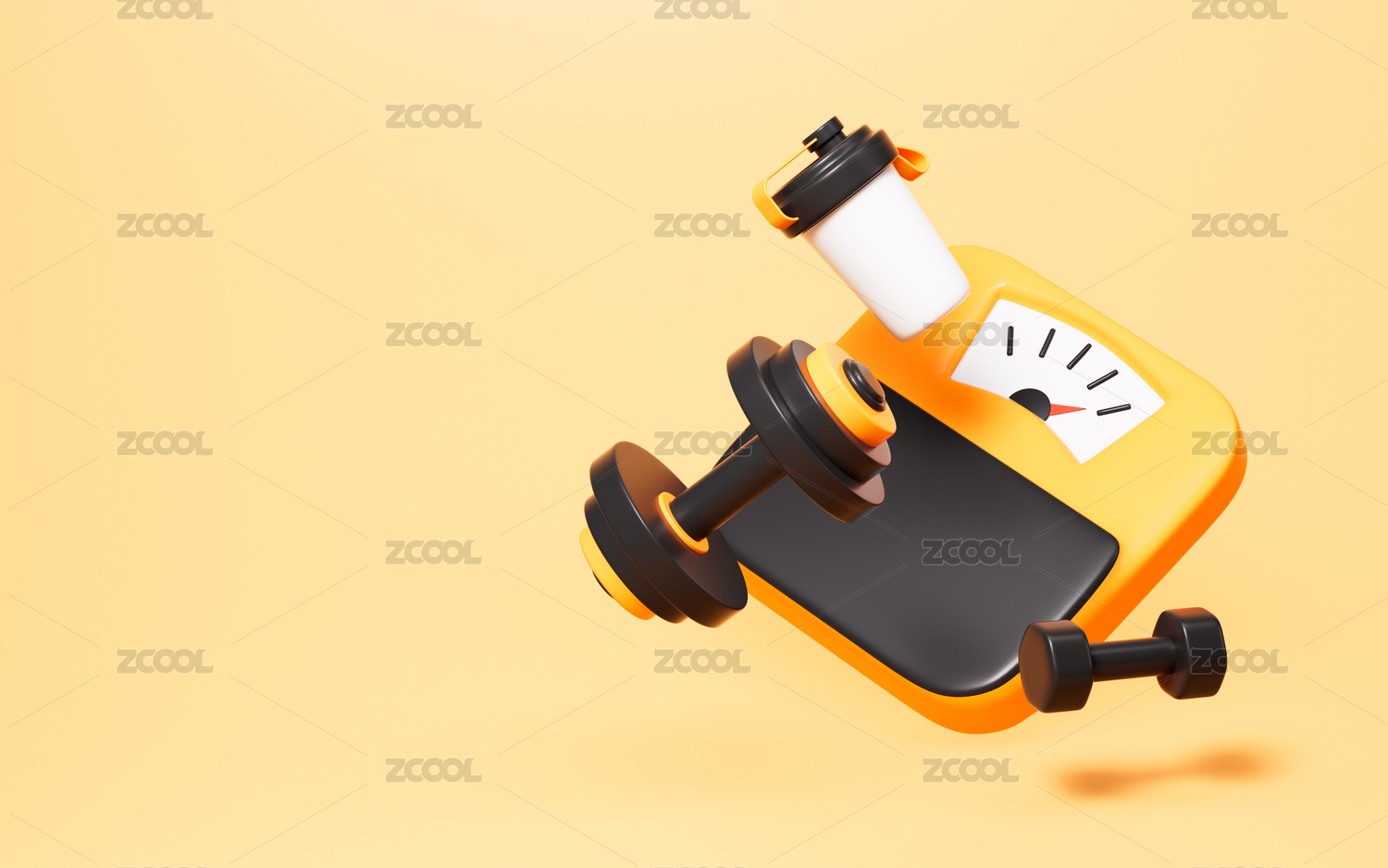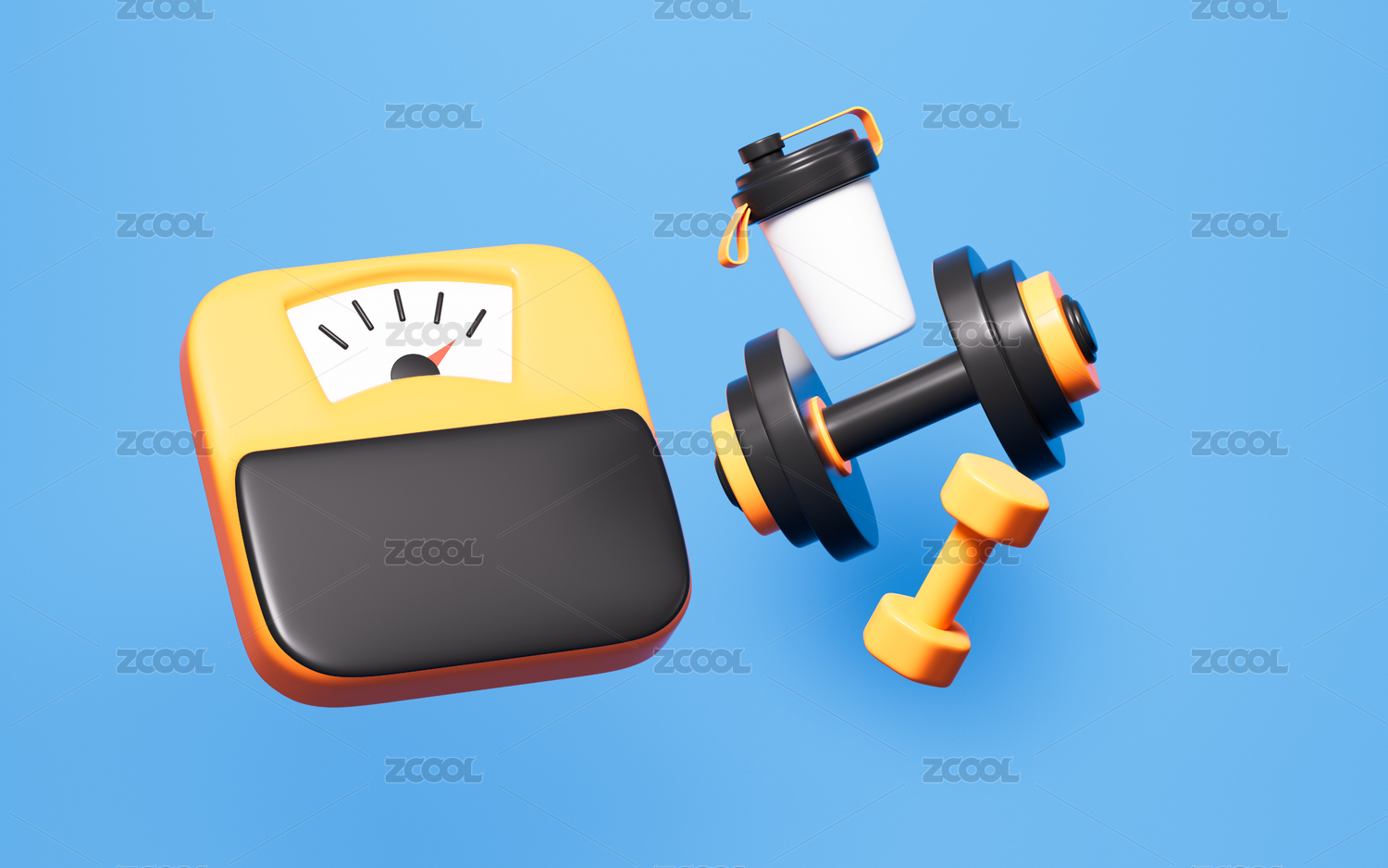 卡通體重計和水杯啞鈴運動模型3D渲染