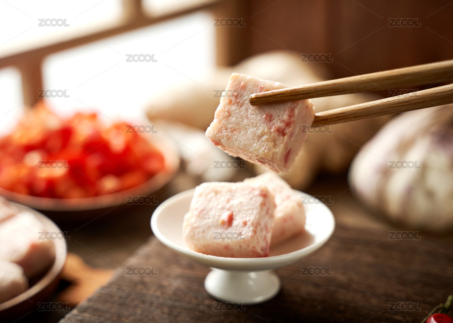 木桌上筷子夾起的魚(yú)籽龍蝦丸子