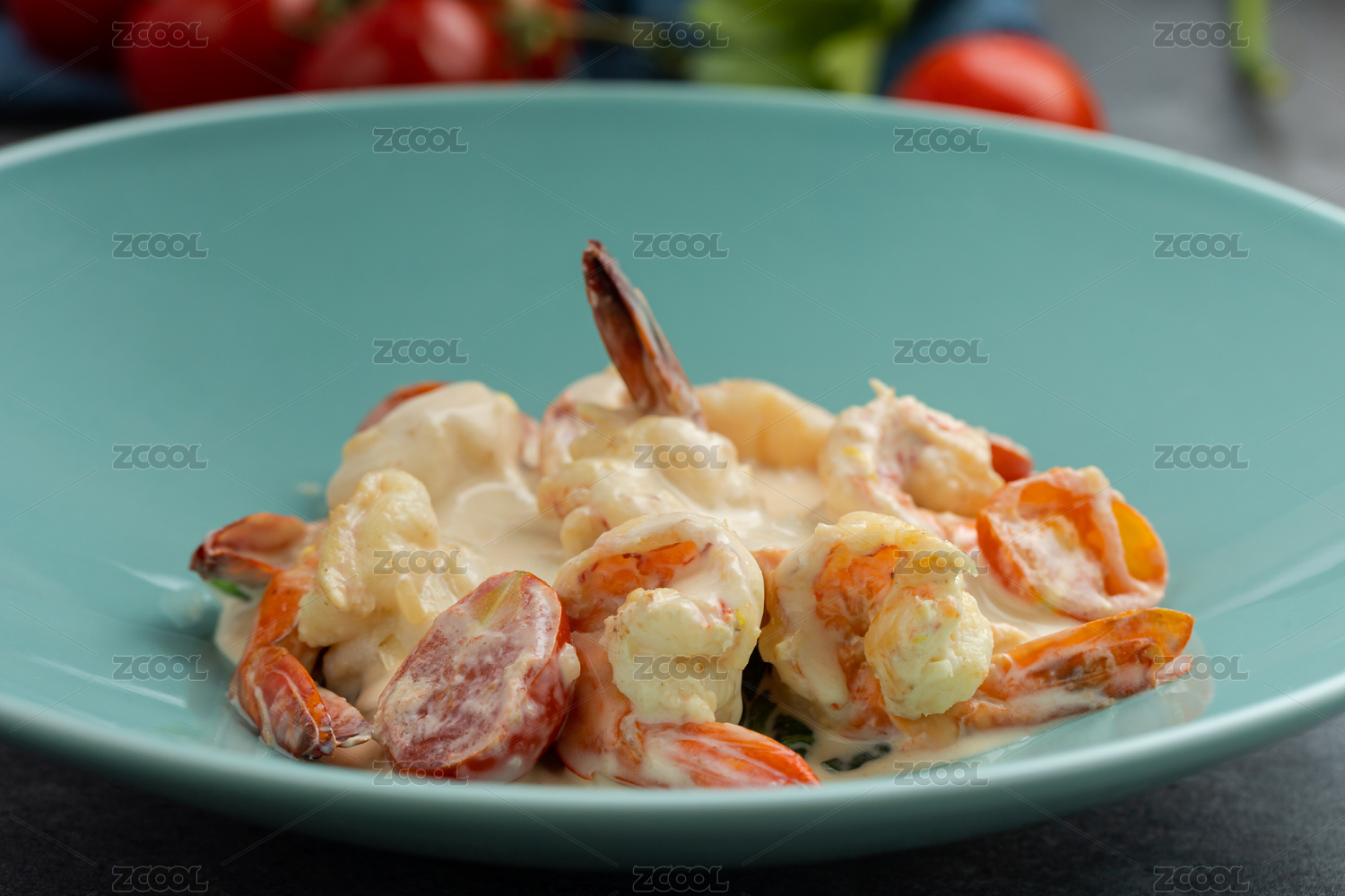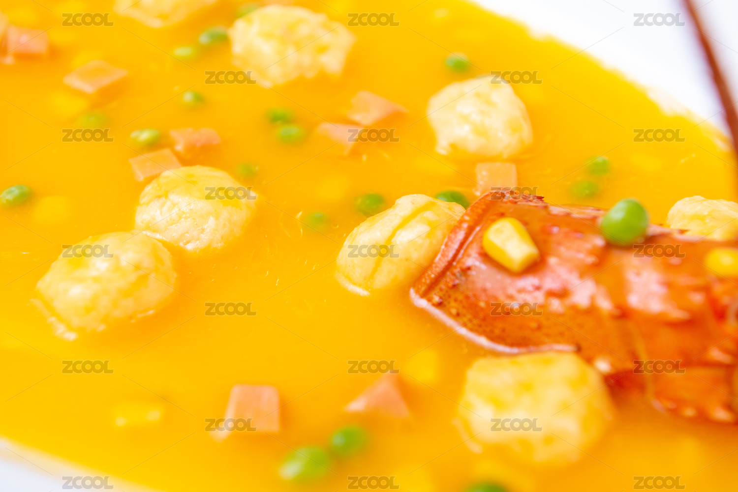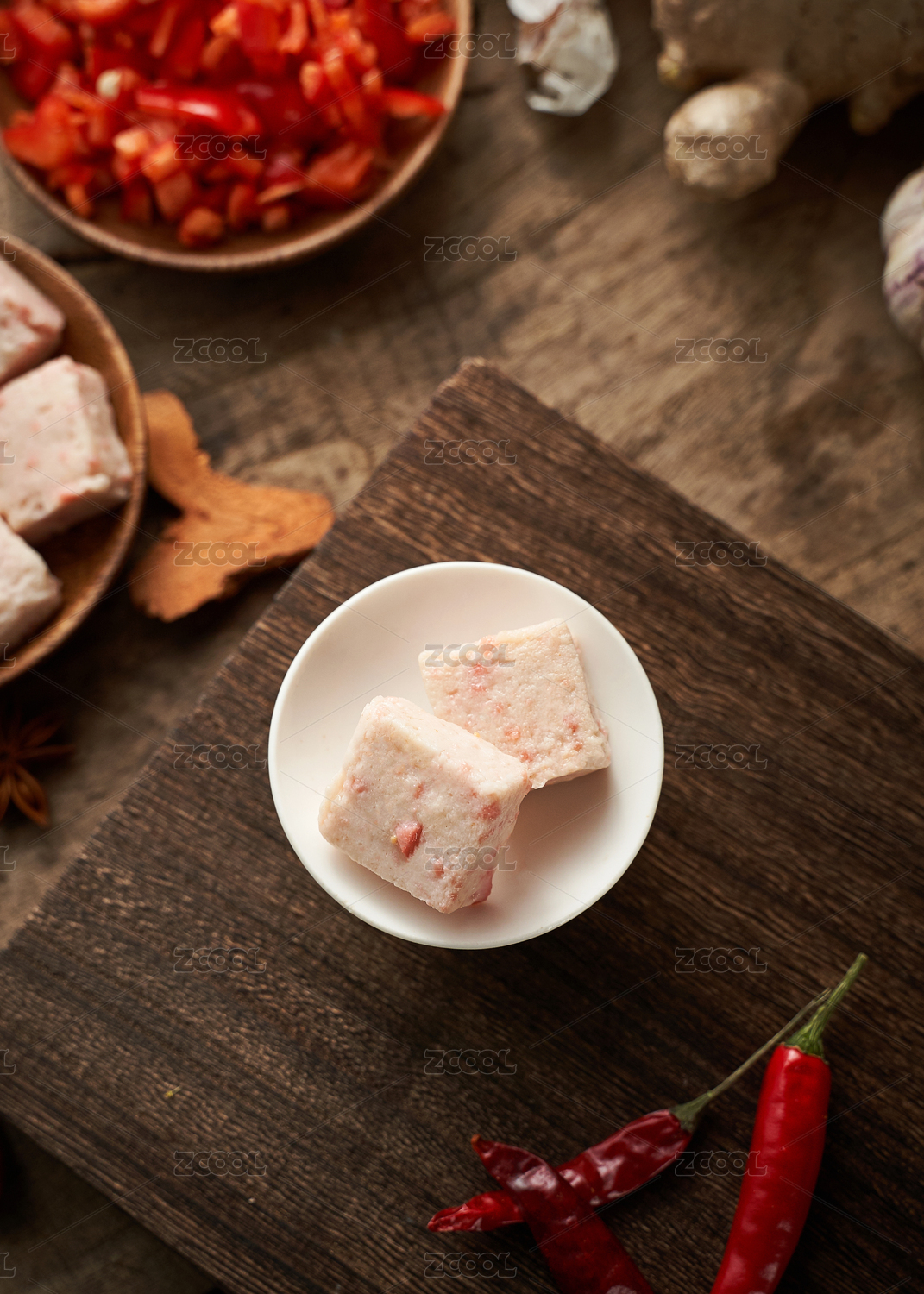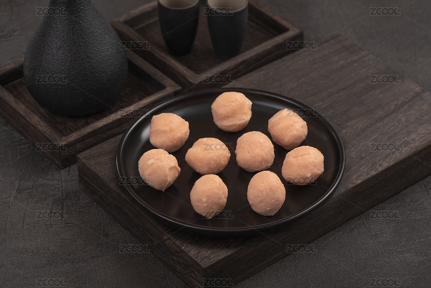 木桌上餐具里擺放的魚(yú)籽龍蝦丸子