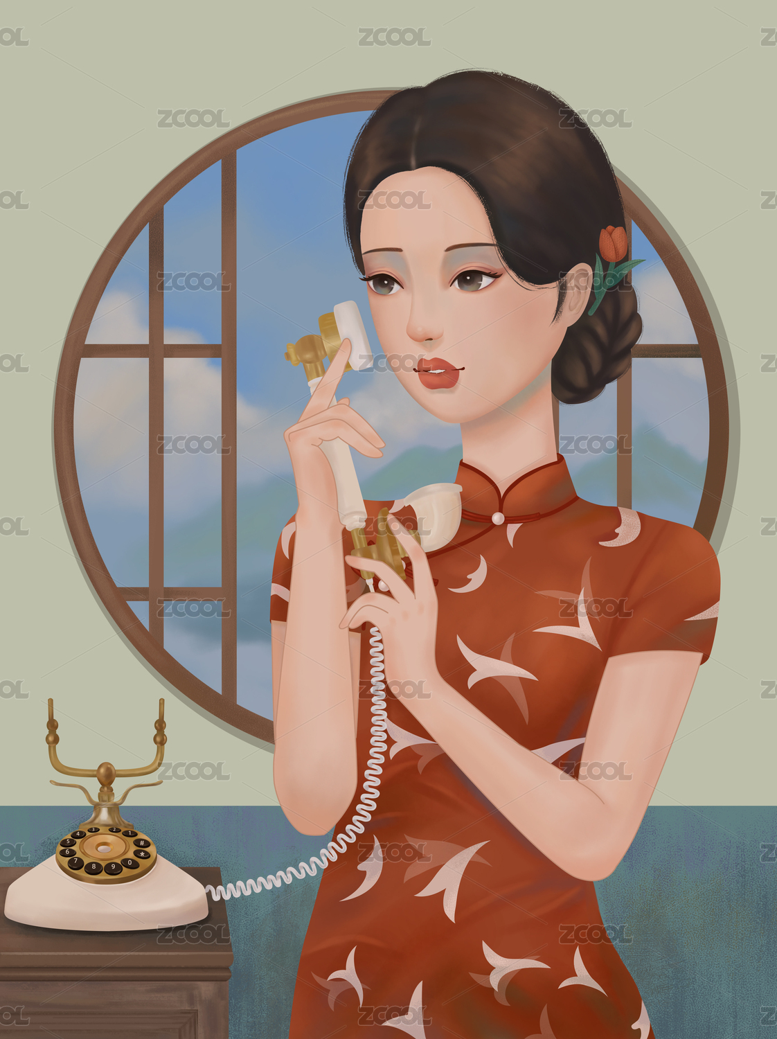 懷念舊時光手拿老式電話打電話的民國女人