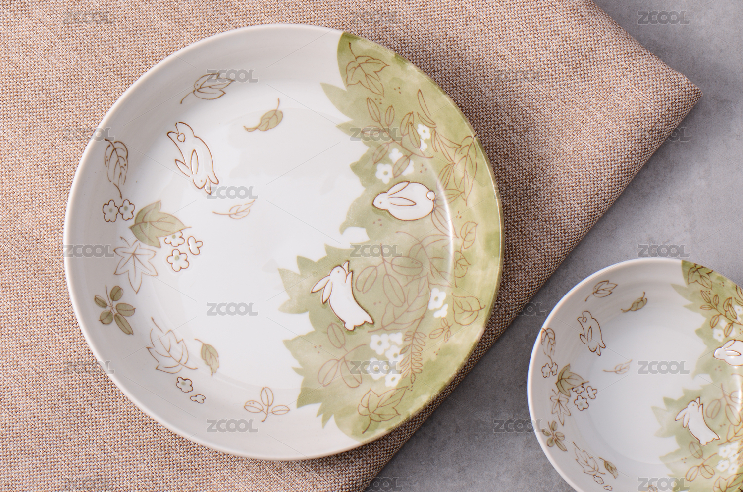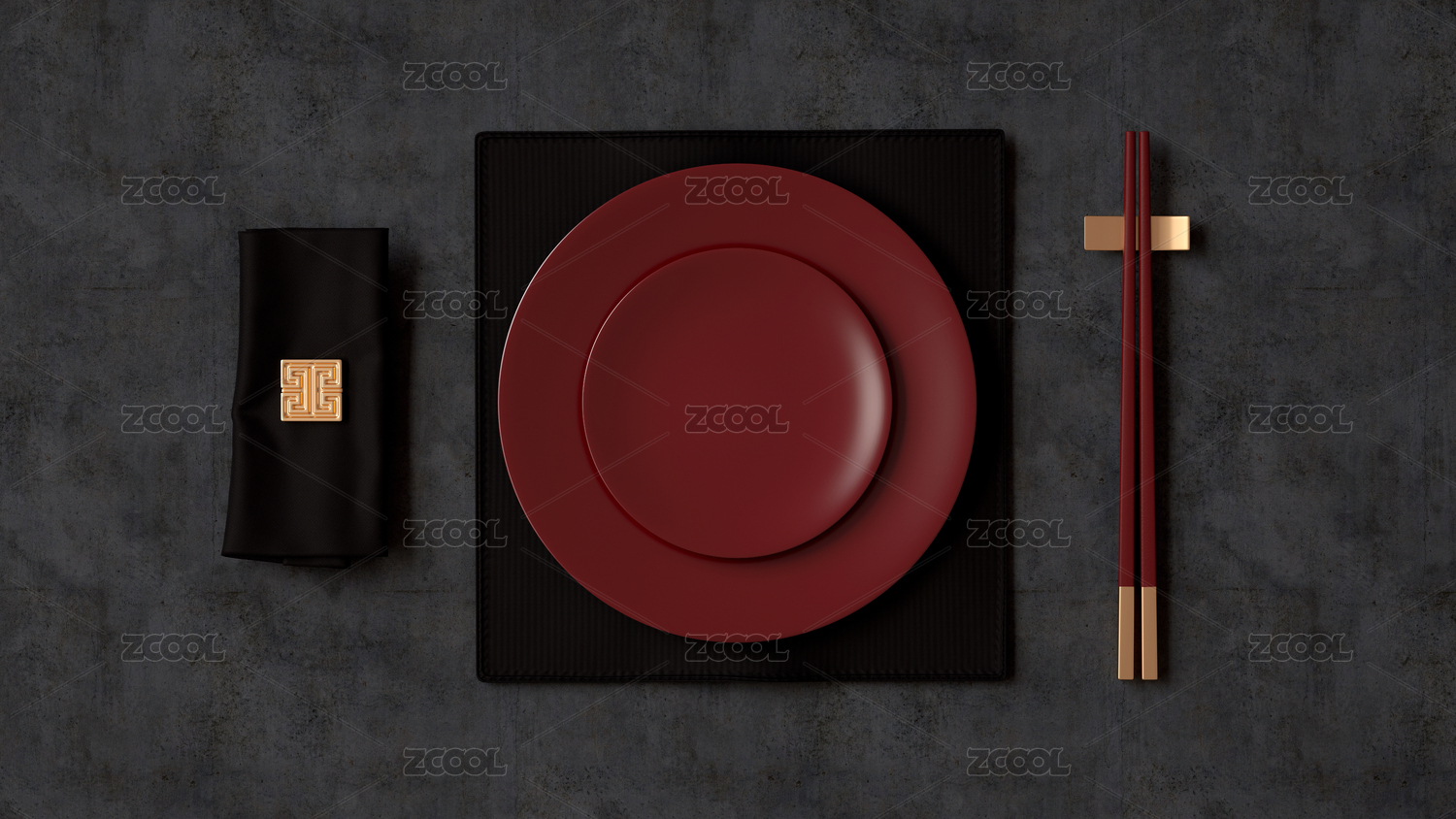 中國風題材的中式餐具套裝,盤子、碟、筷子、筷子托和餐巾,3d渲染