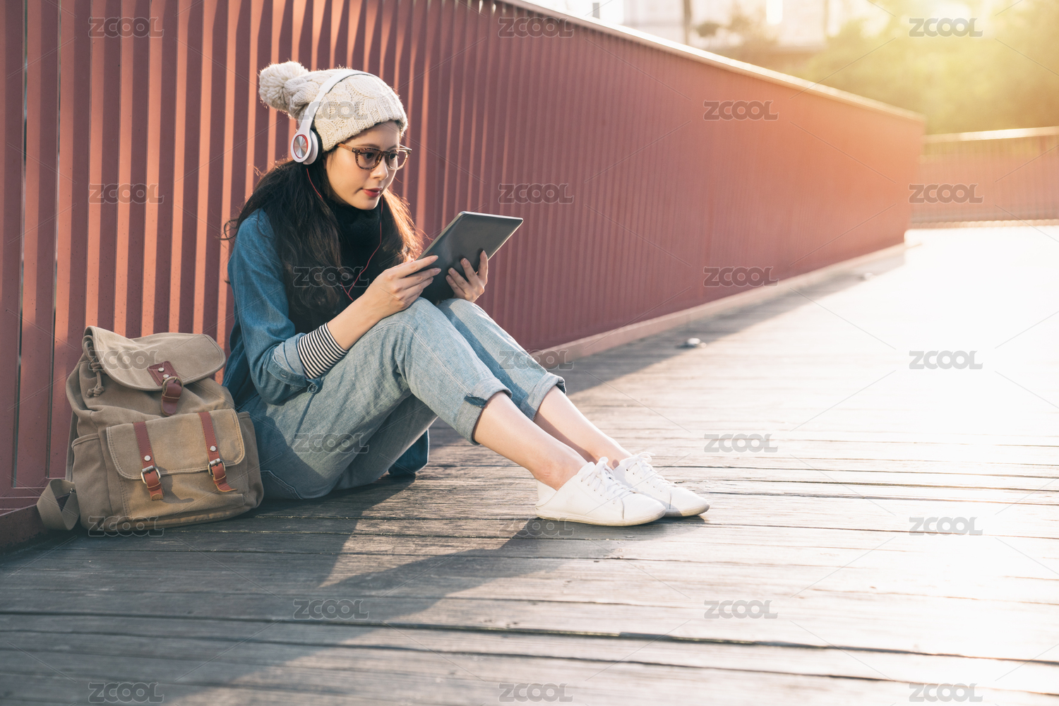 迷人的姑娘閱讀和瀏覽電子書(shū)或平板坐在公園的橋面