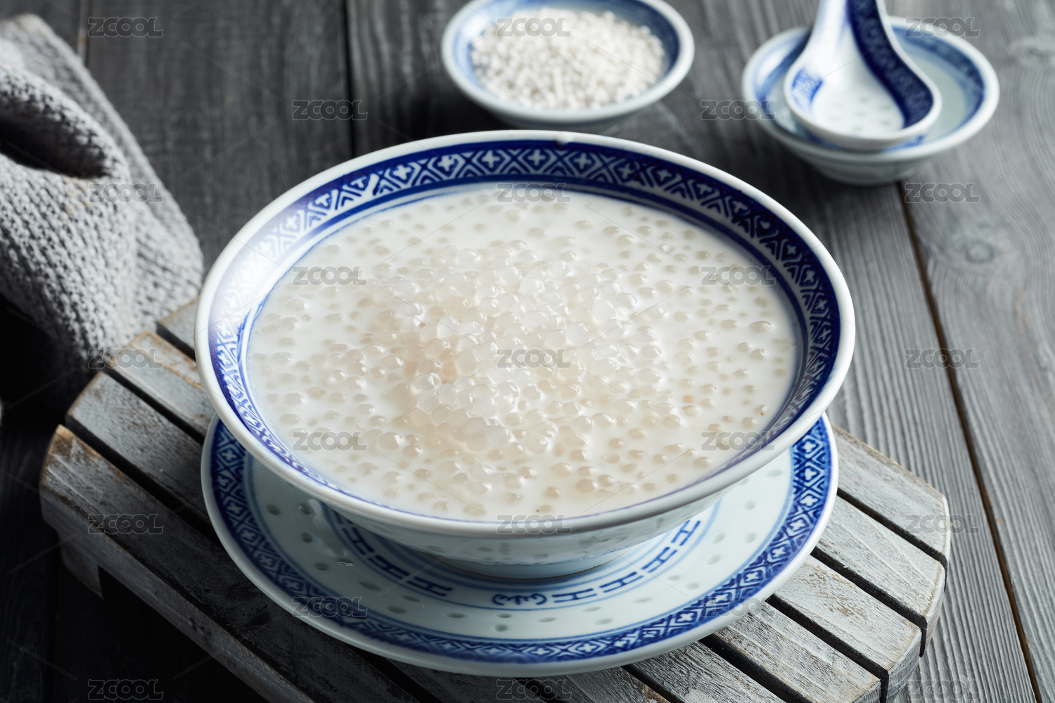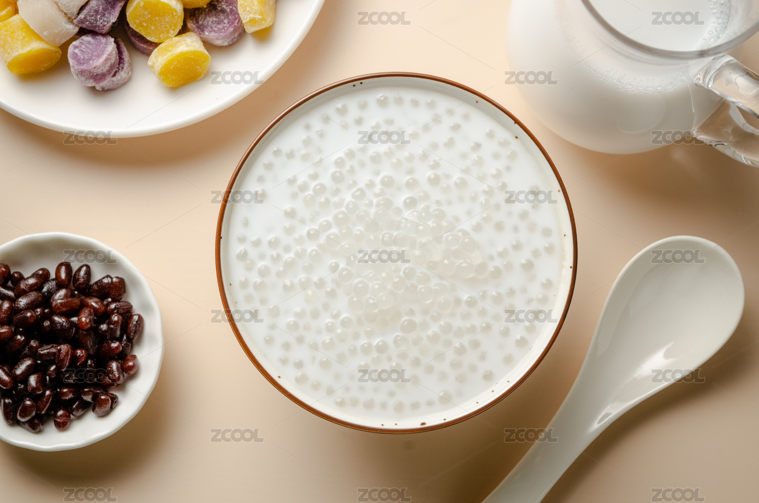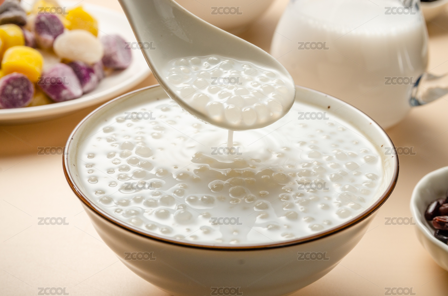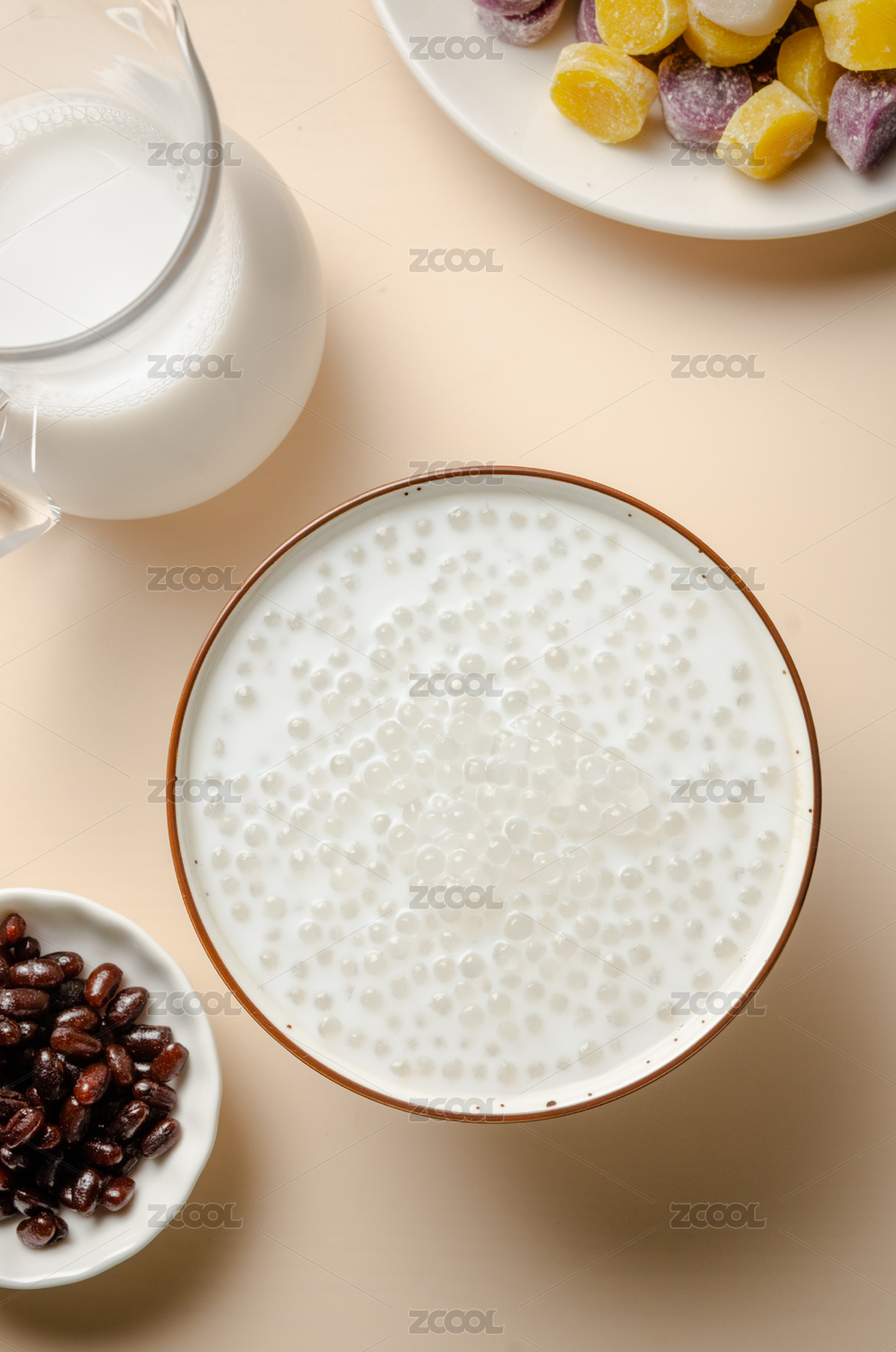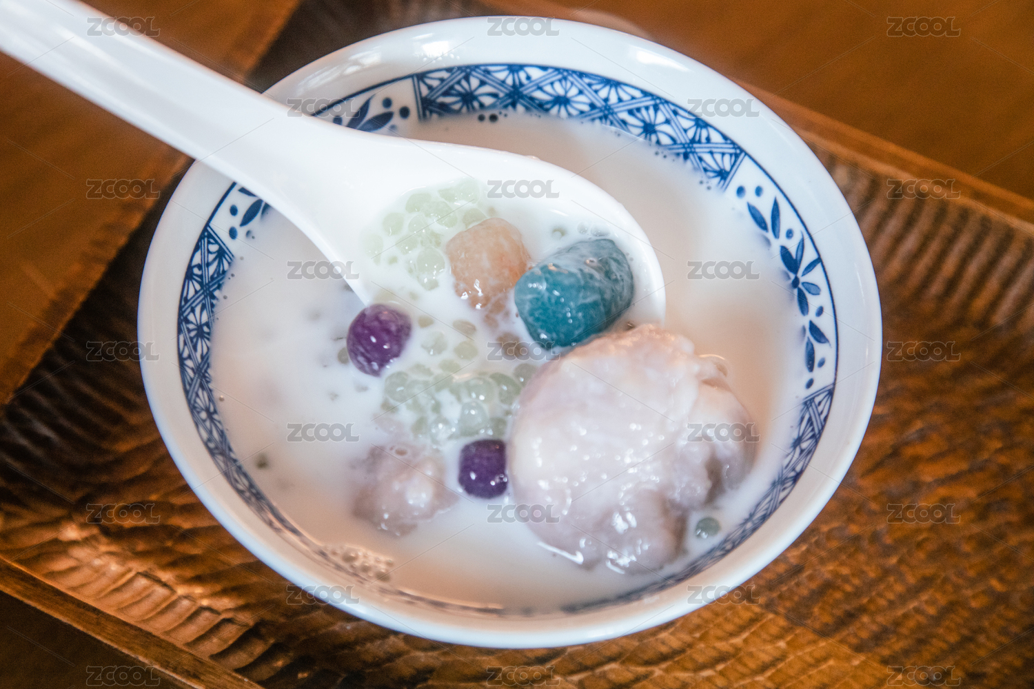 室內(nèi)餐桌上的一碗芋圓椰汁西米露甜品