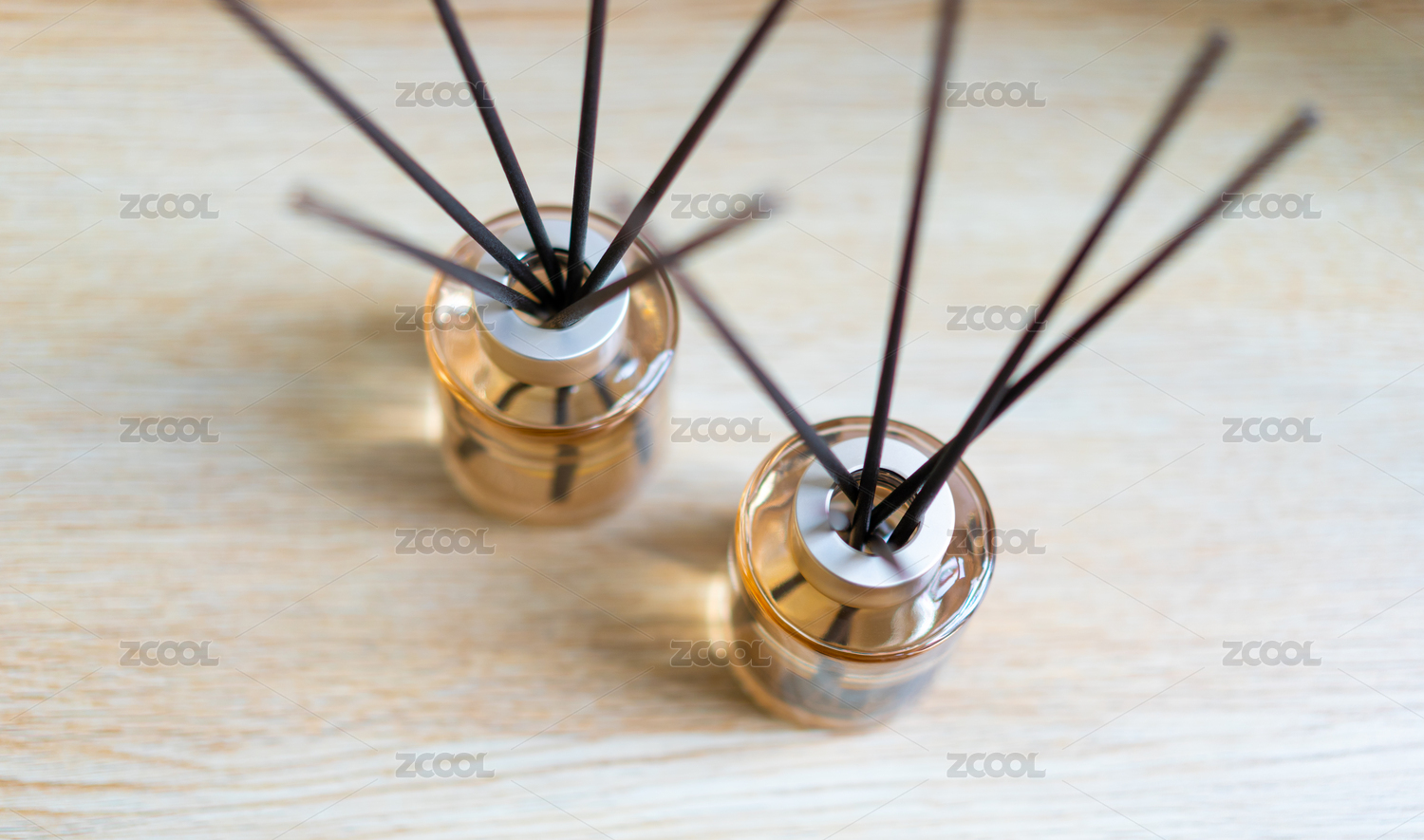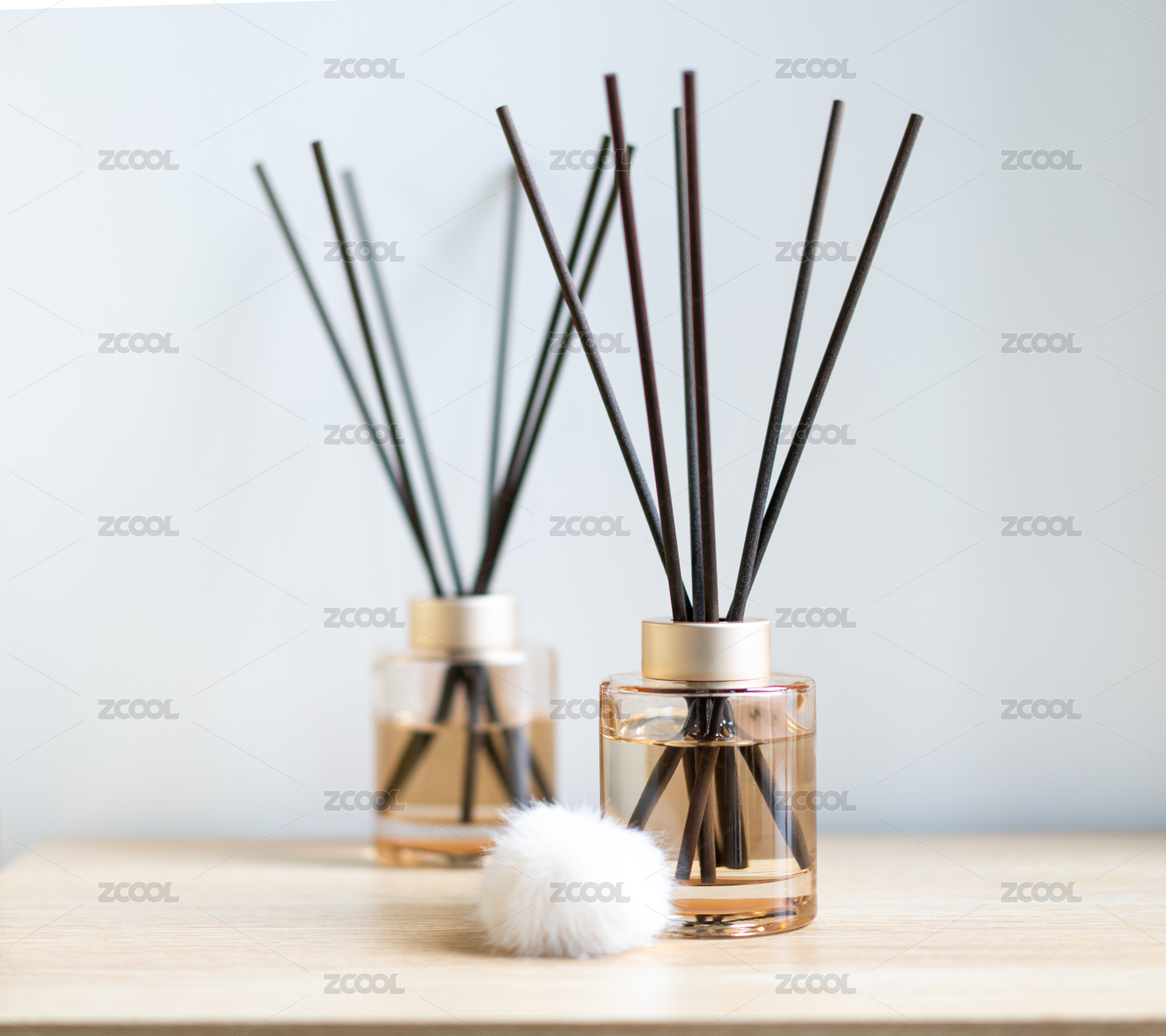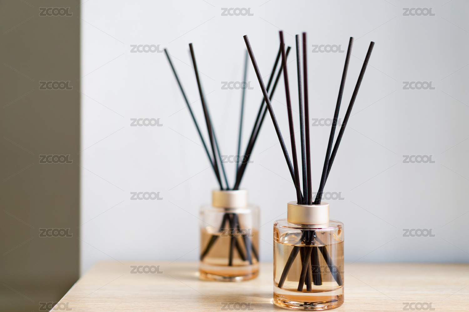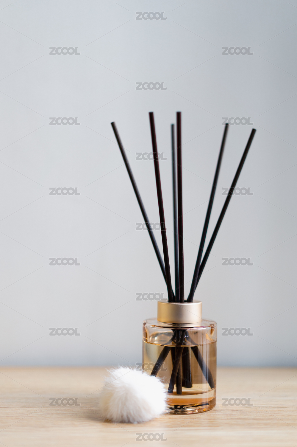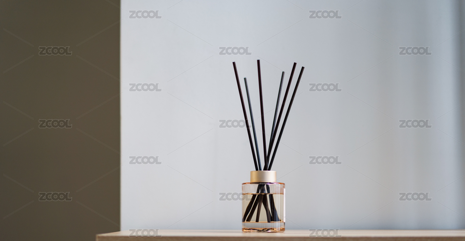 天然檀香無火香薰放在木質(zhì)桌子上靠著白墻