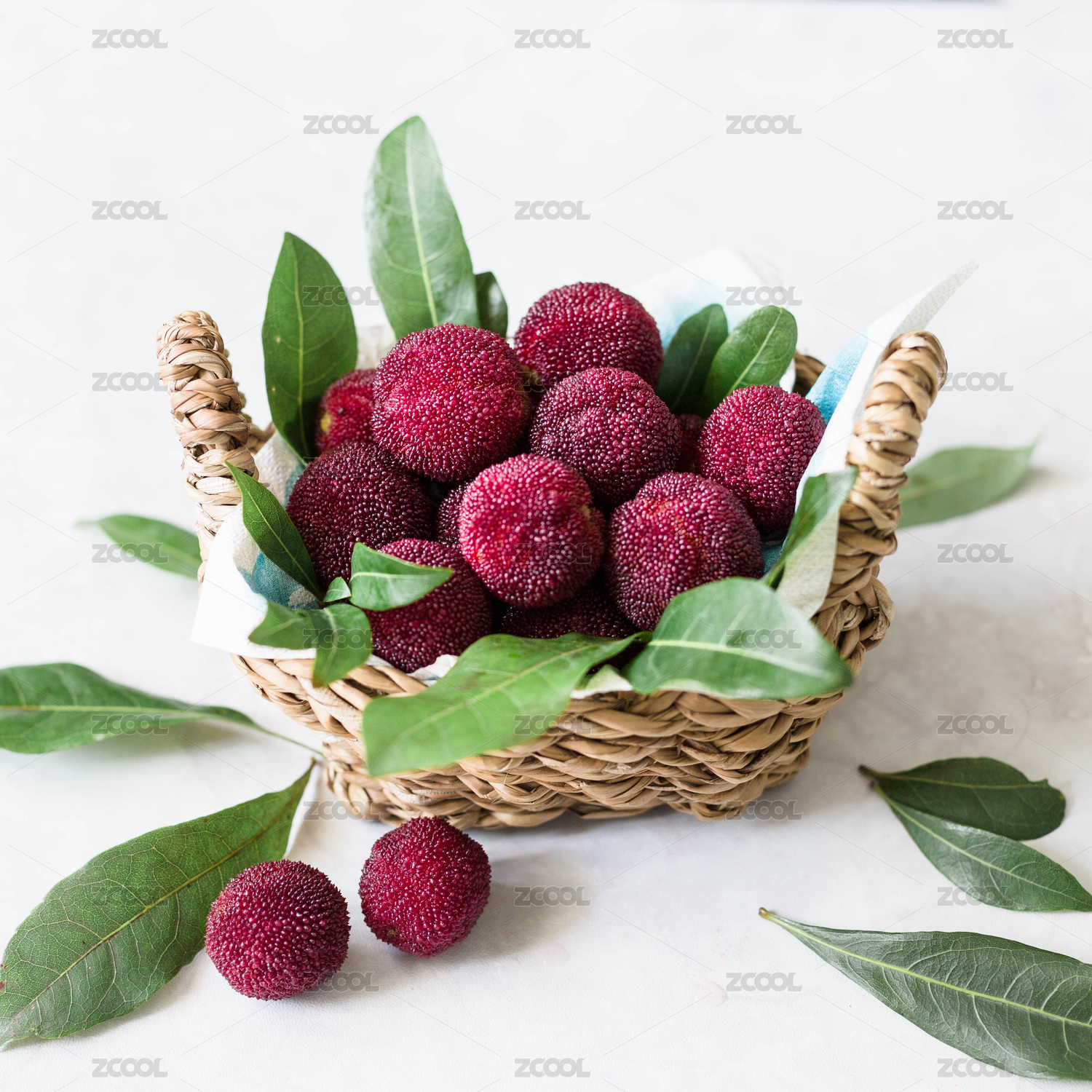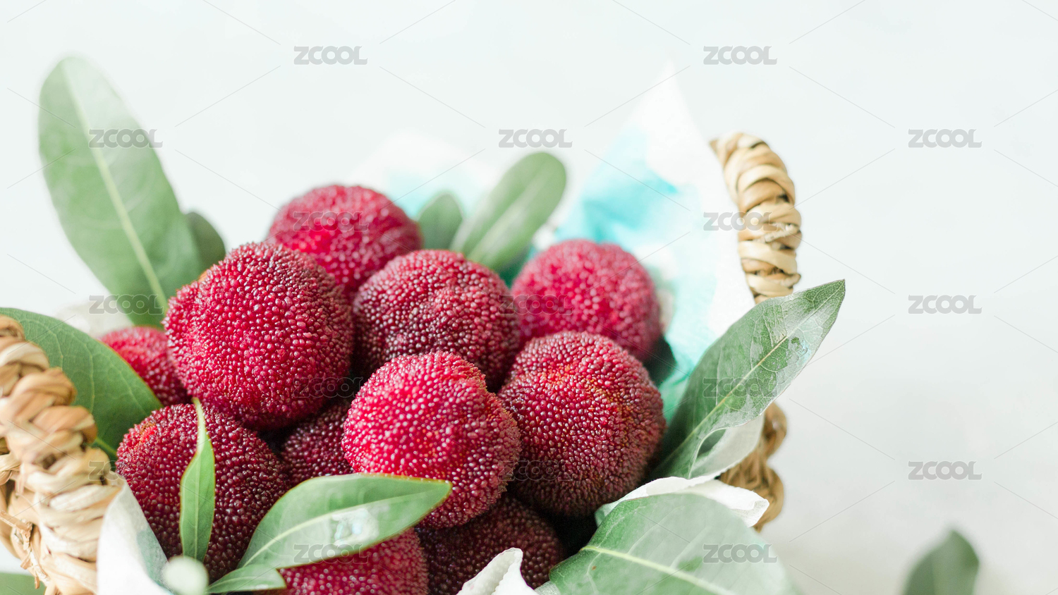 白色背景藤條籃筐多個新鮮楊梅