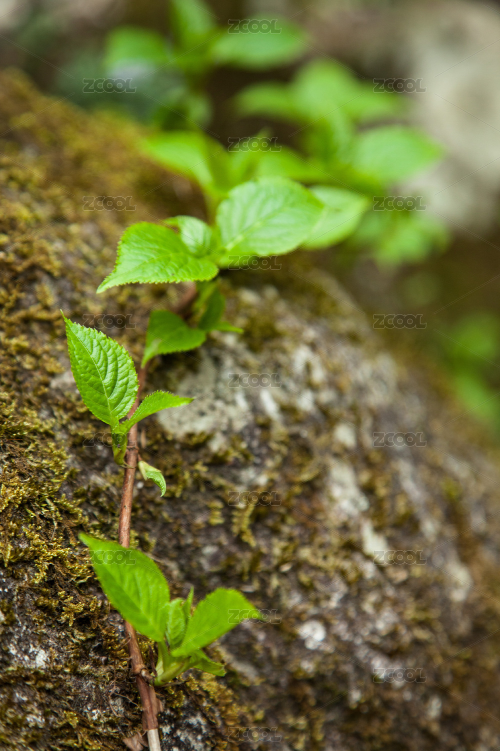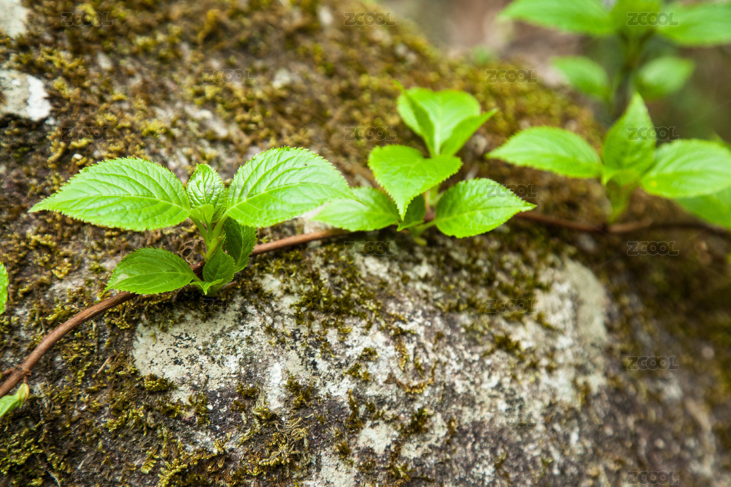 巖石上面有綠葉的藤條