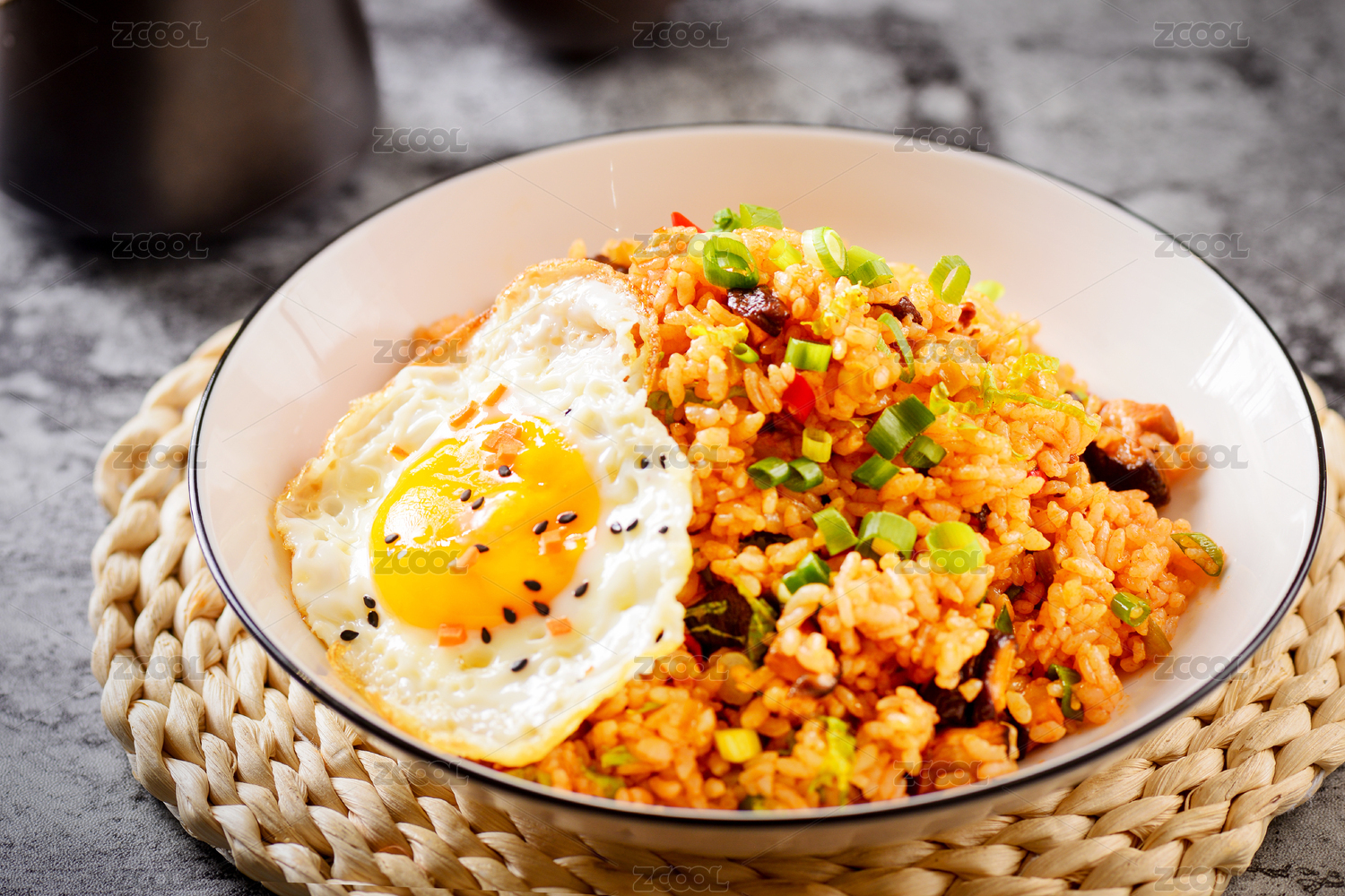 一碗紅色炒飯加煎蛋放在藤條上