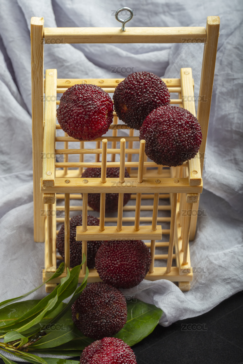 一小提籃紅色的中國(guó)楊梅放在黑色背景布上