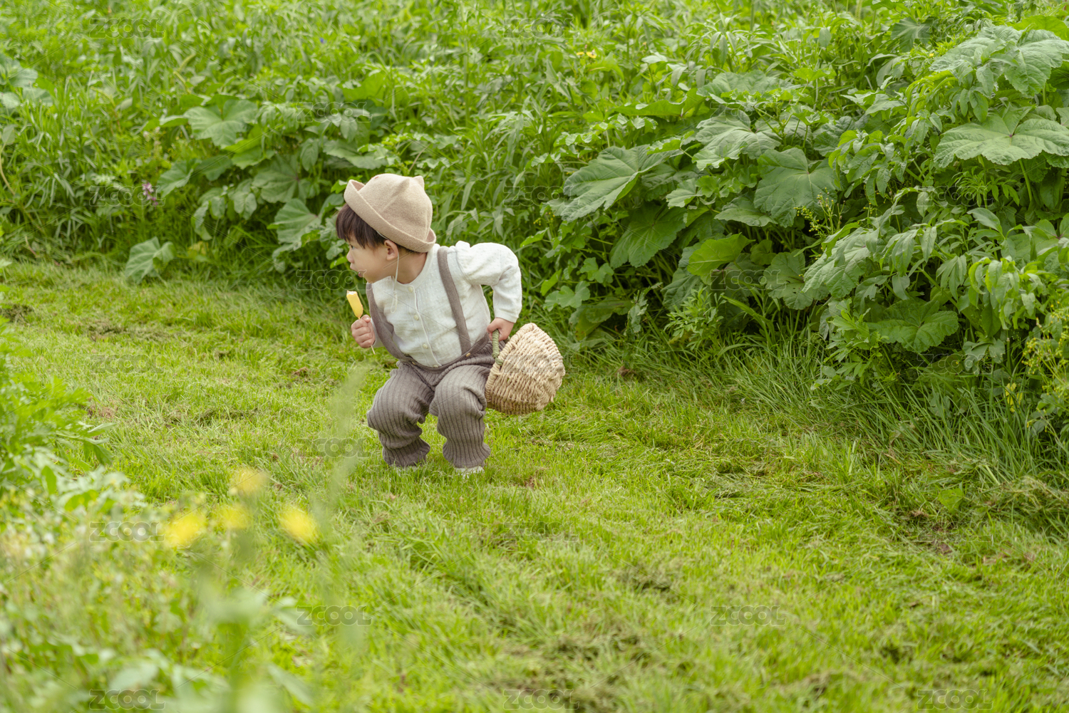 野外草坪上提籃游玩的時(shí)尚小男孩
