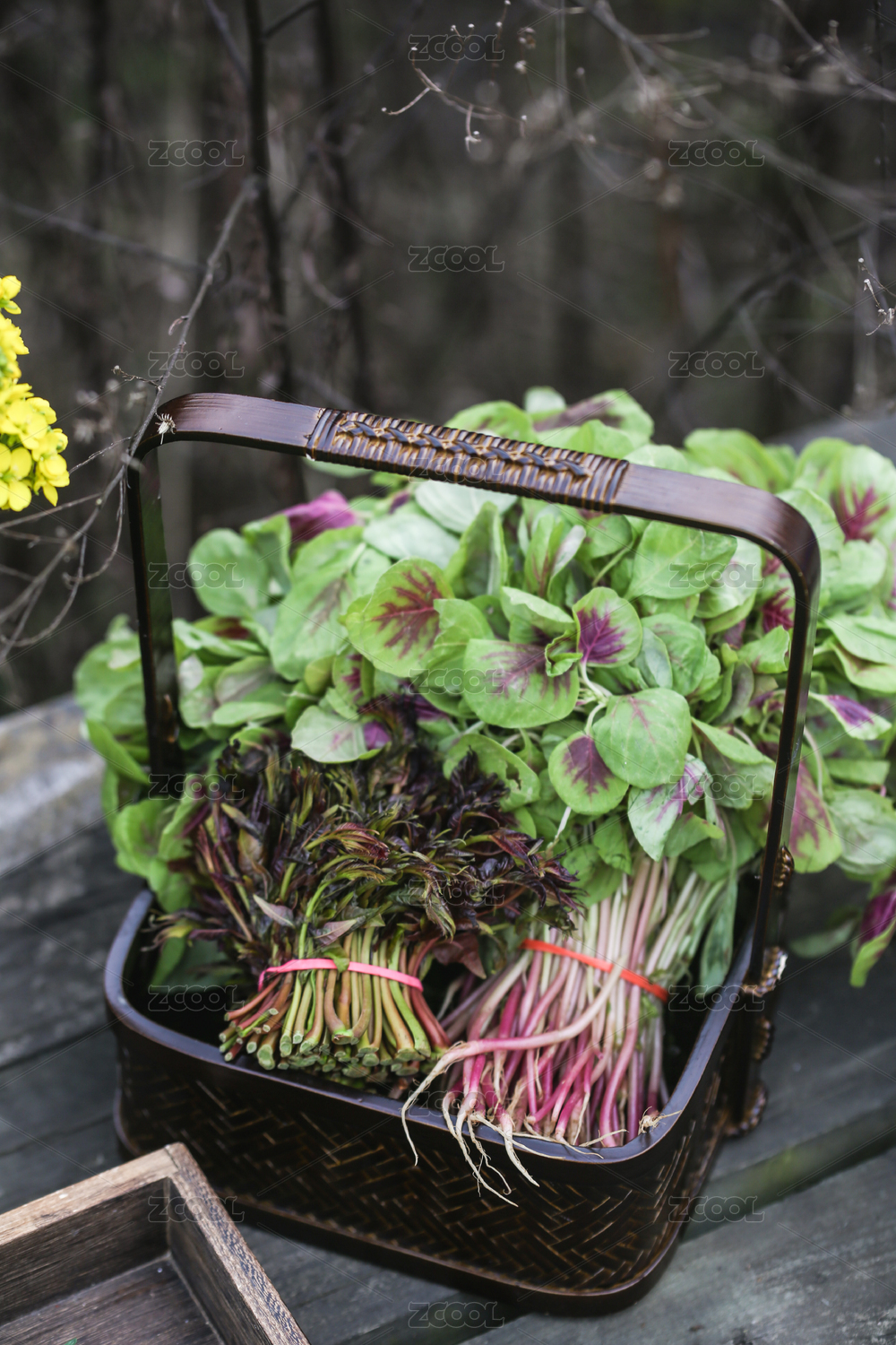 提籃里擺放整齊的新鮮野菜,香椿和莧菜