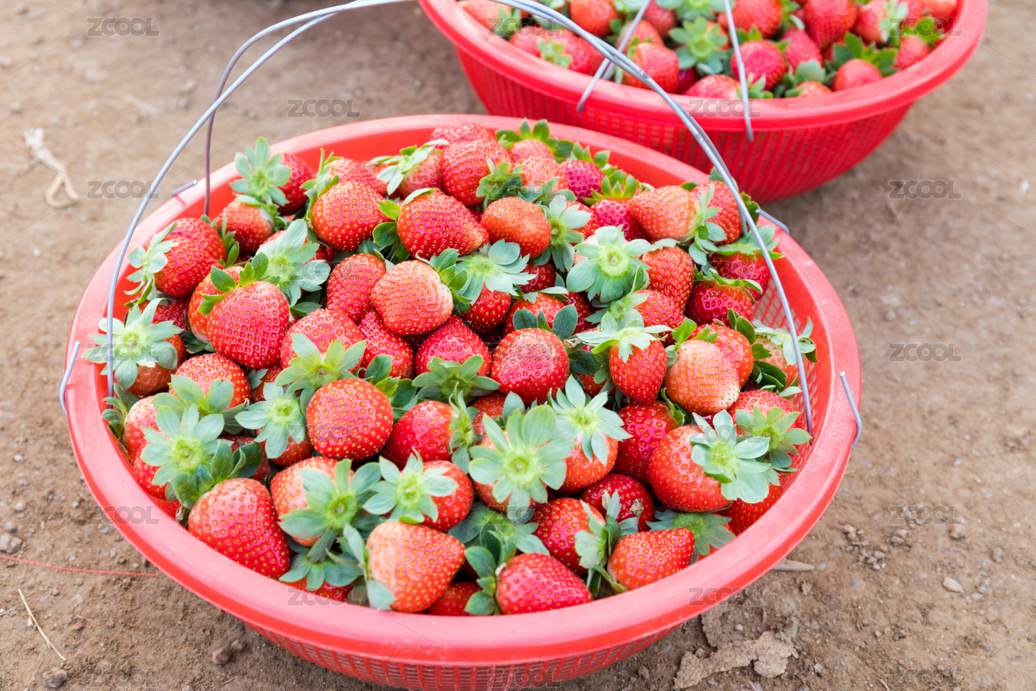 地面上的手提籃裝滿新鮮的紅色草莓