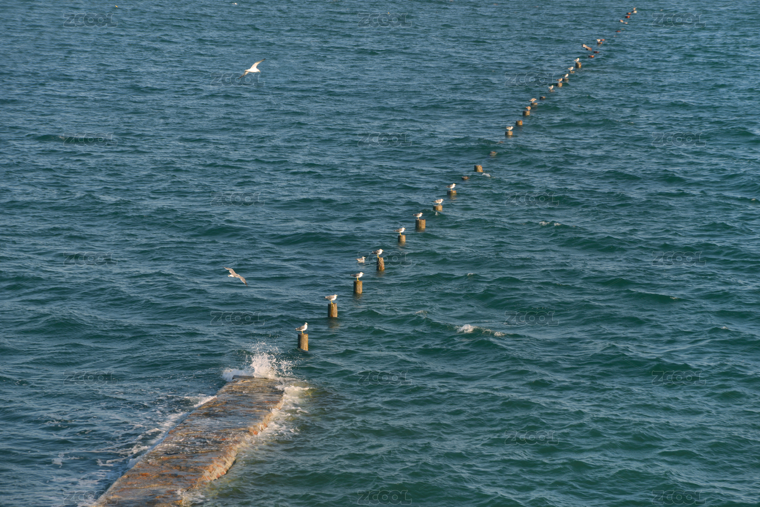 中國(guó)山東青島海灣漲潮時(shí)防浪堤上休息的海鷗