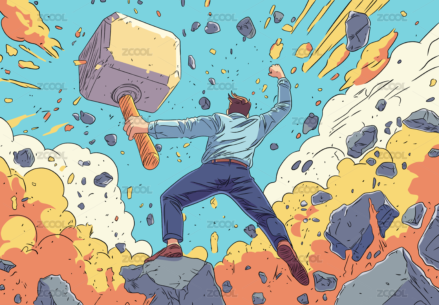 手舉大錘憤怒吶喊打砸的人卡通插畫