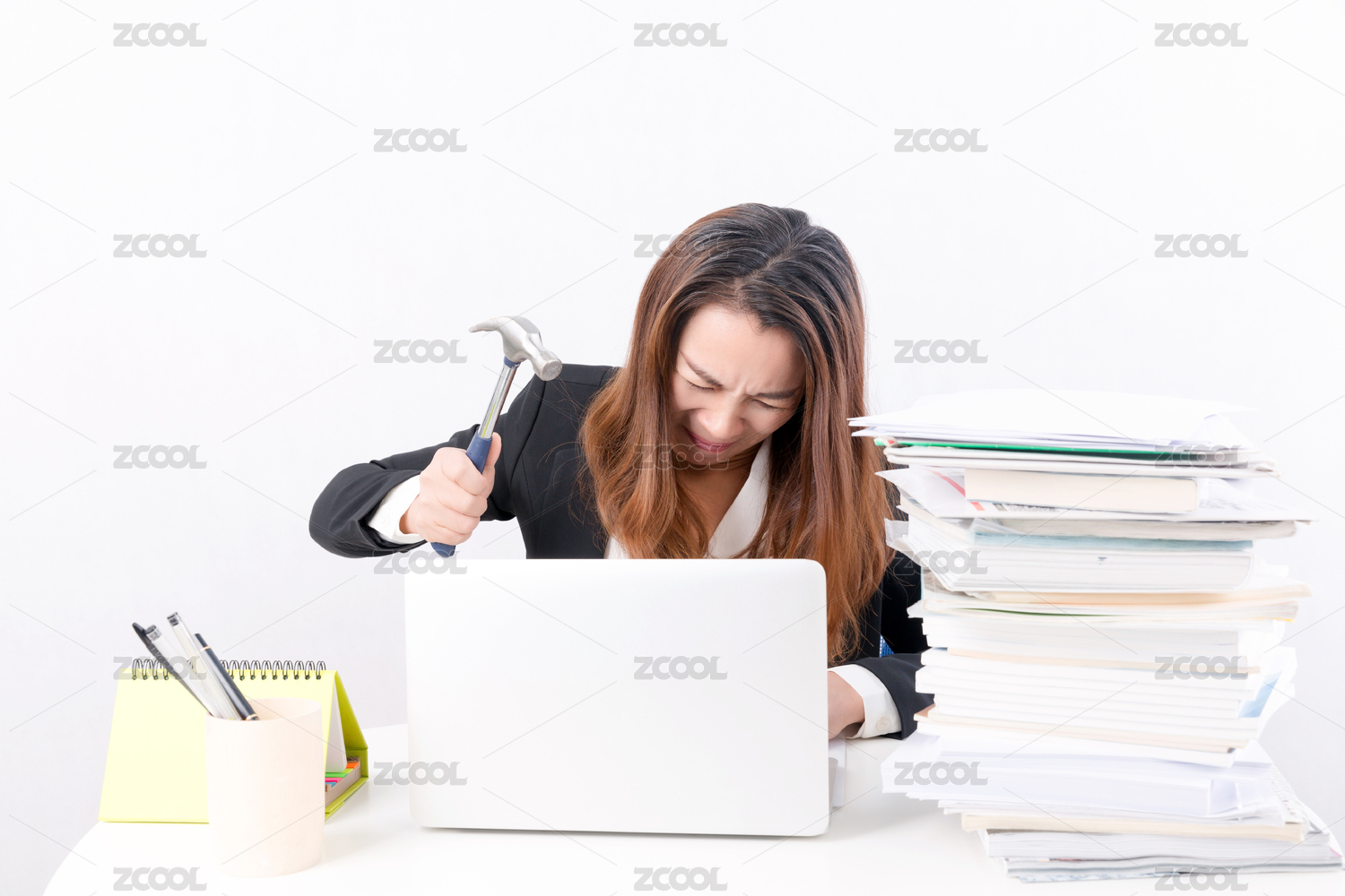 憤怒的上班族白領(lǐng)女性手拿錘子發(fā)泄情緒