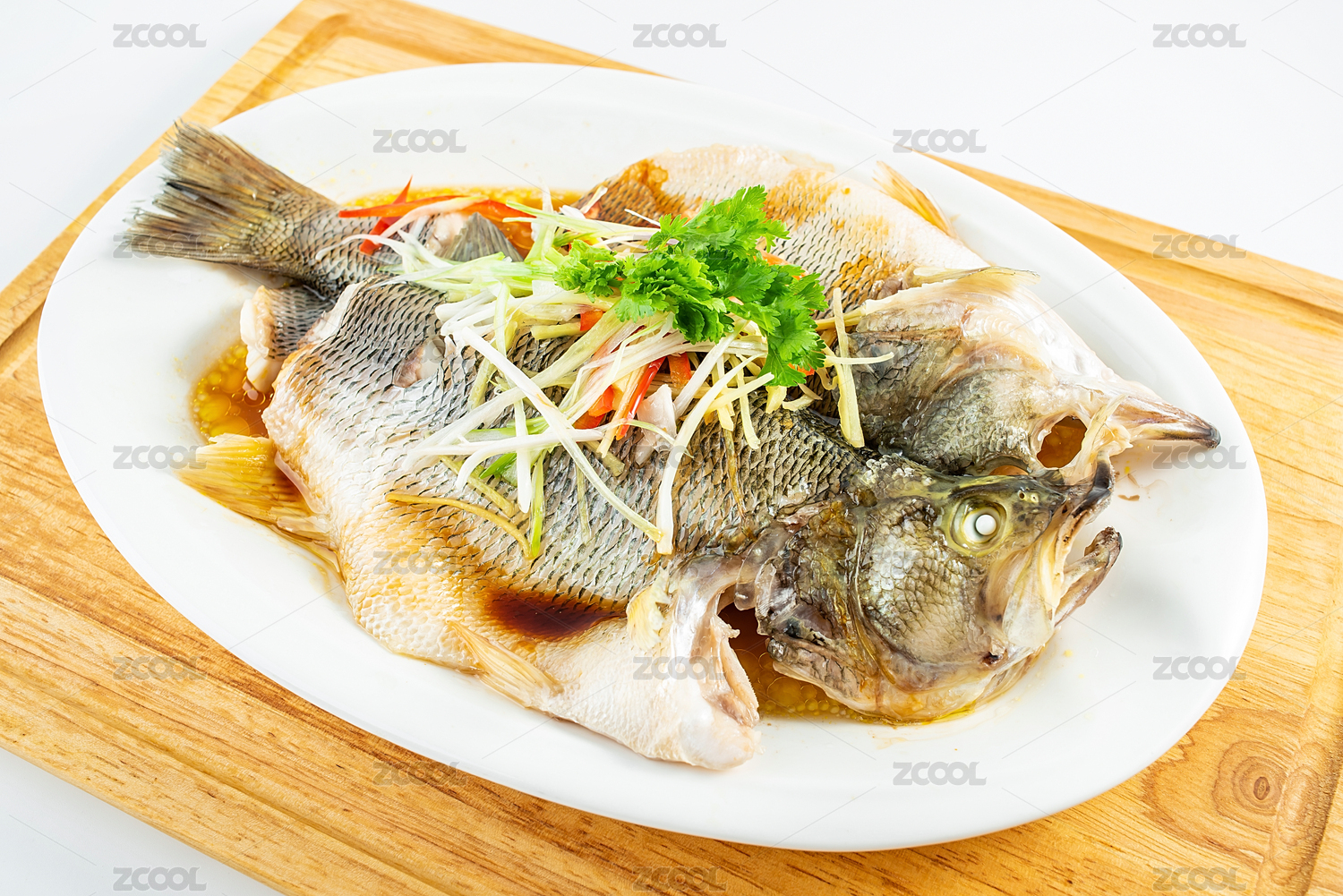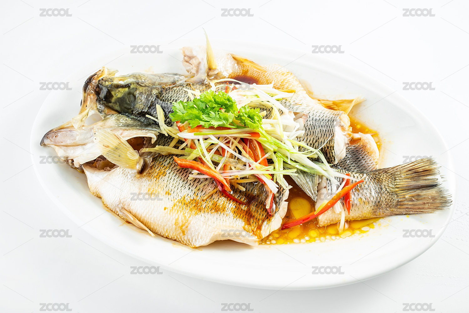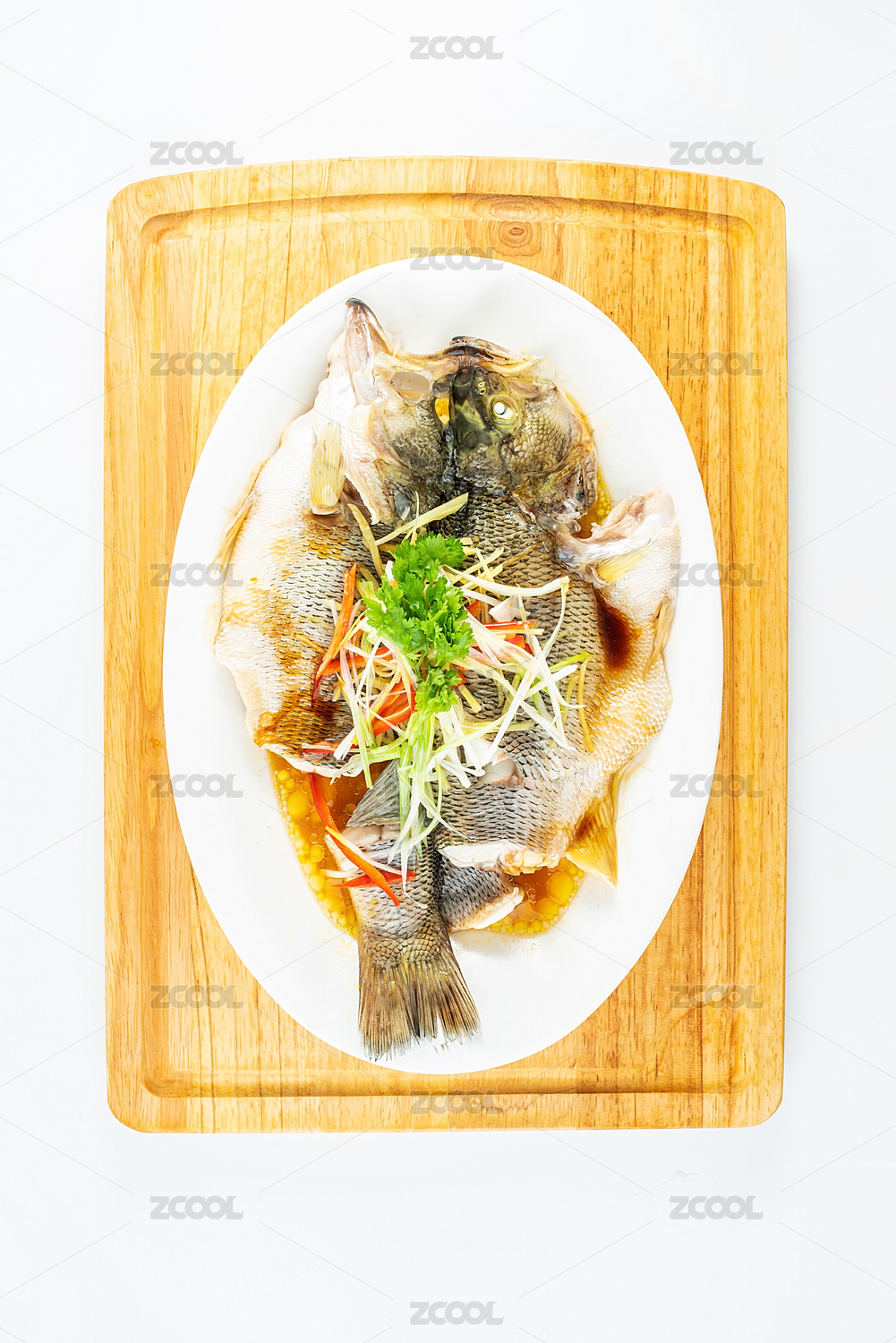 中國(guó)粵菜一碟清蒸鱸魚(yú)在白背景上