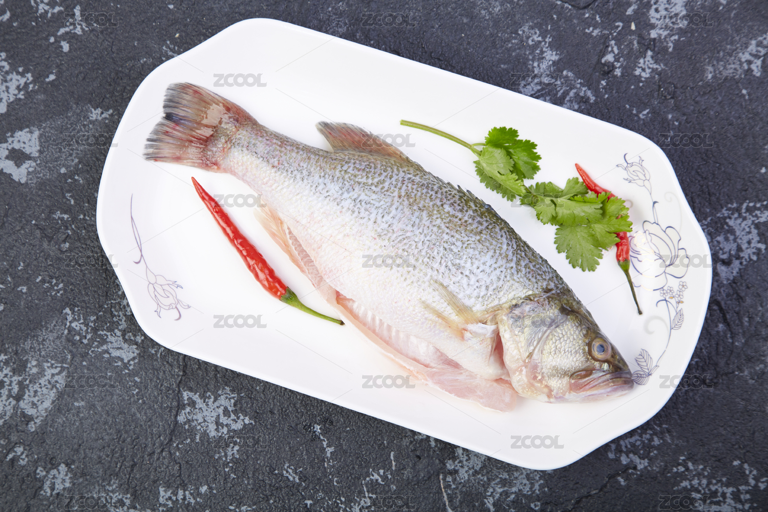 深灰色背景上暗紅色陶盤(pán)中的清蒸武昌魚(yú)