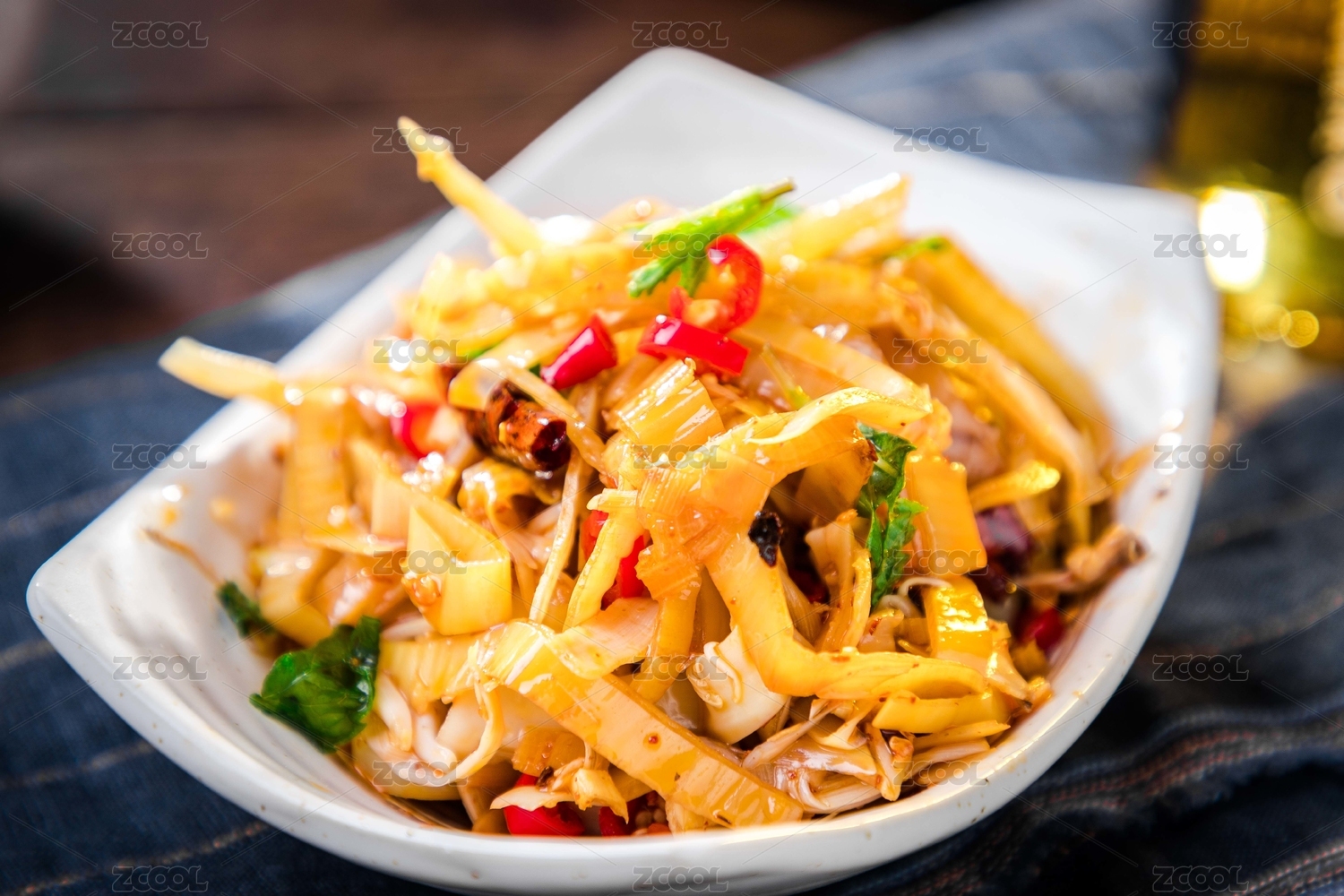 木紋桌面上有一盤(pán)煙筍炒臘肉