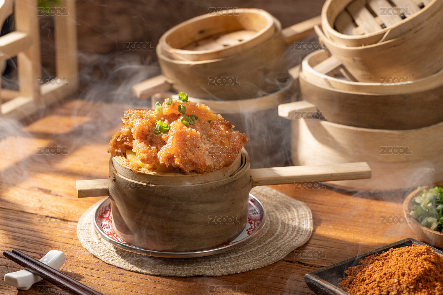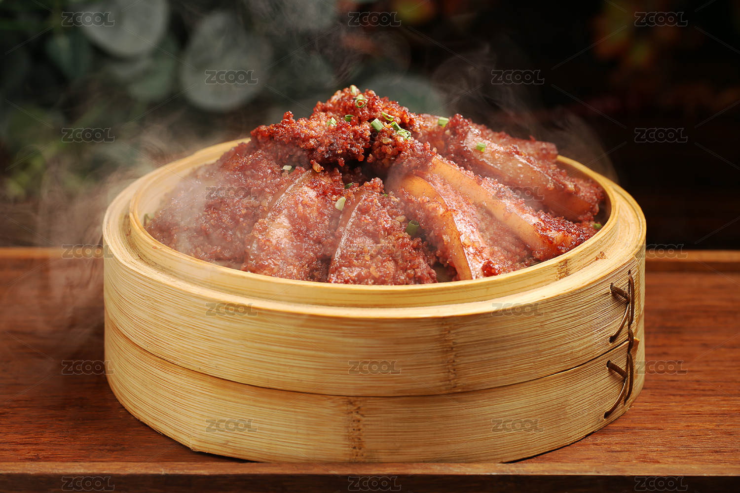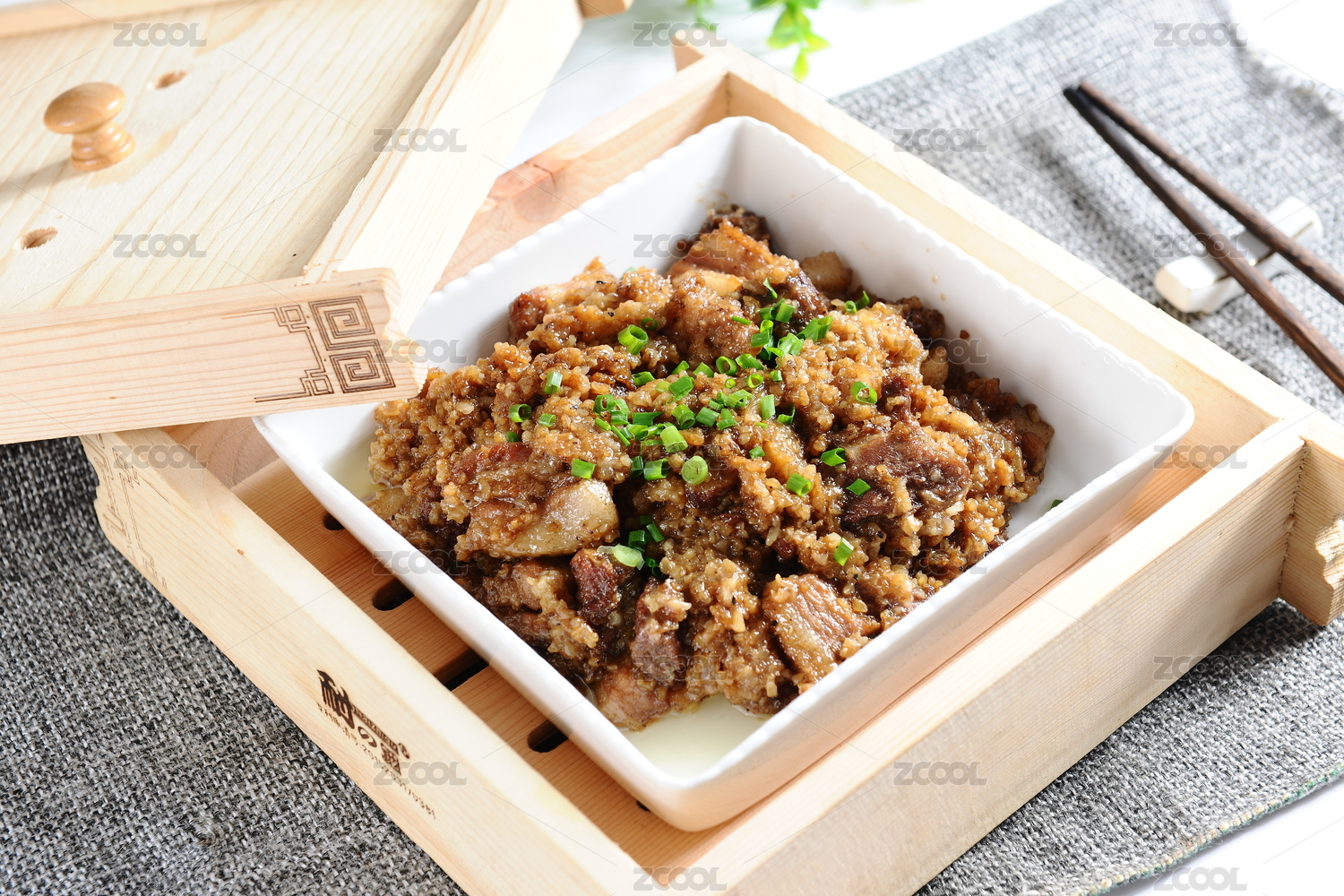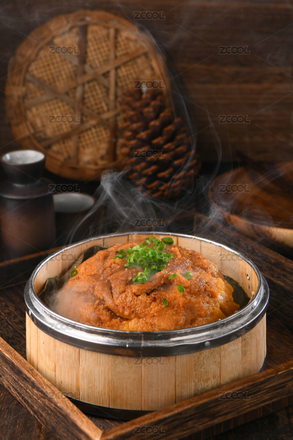 木托盤上放著的一個蒸屜里的冒著熱氣的粉蒸肉