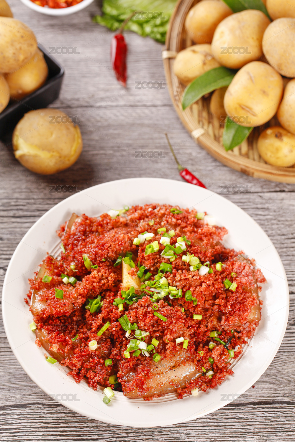 小蒸籠上的川味粉蒸肉粉蒸肥腸