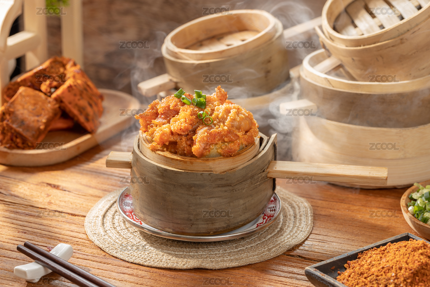 小蒸籠上的川味粉蒸肉粉蒸排骨