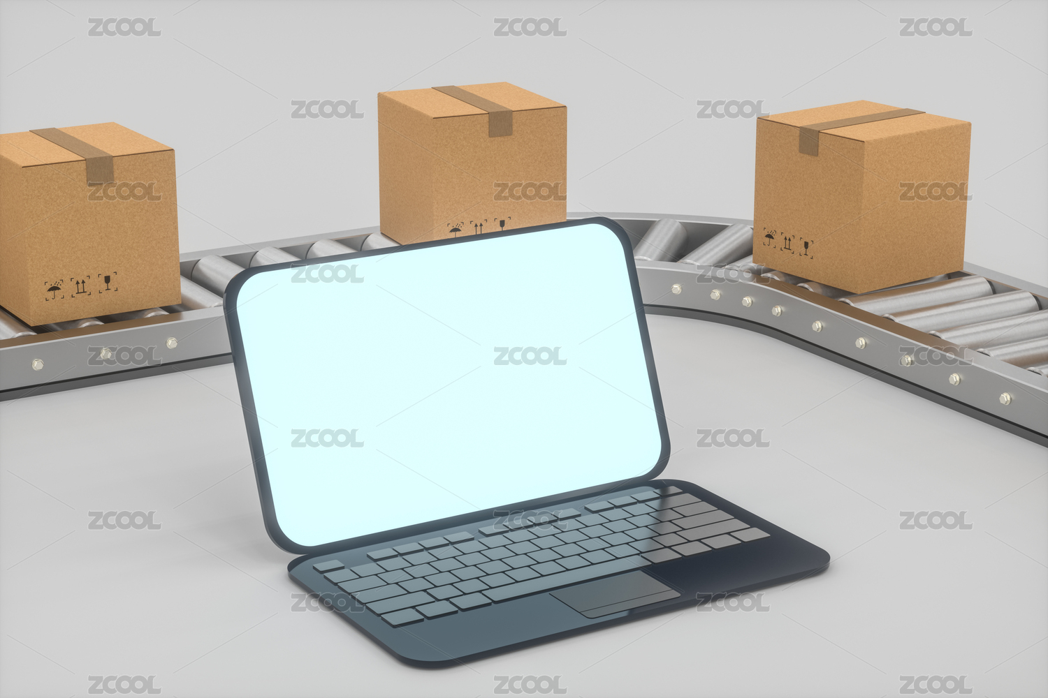 筆記本計(jì)算機(jī)與貨物傳送帶 三維渲染