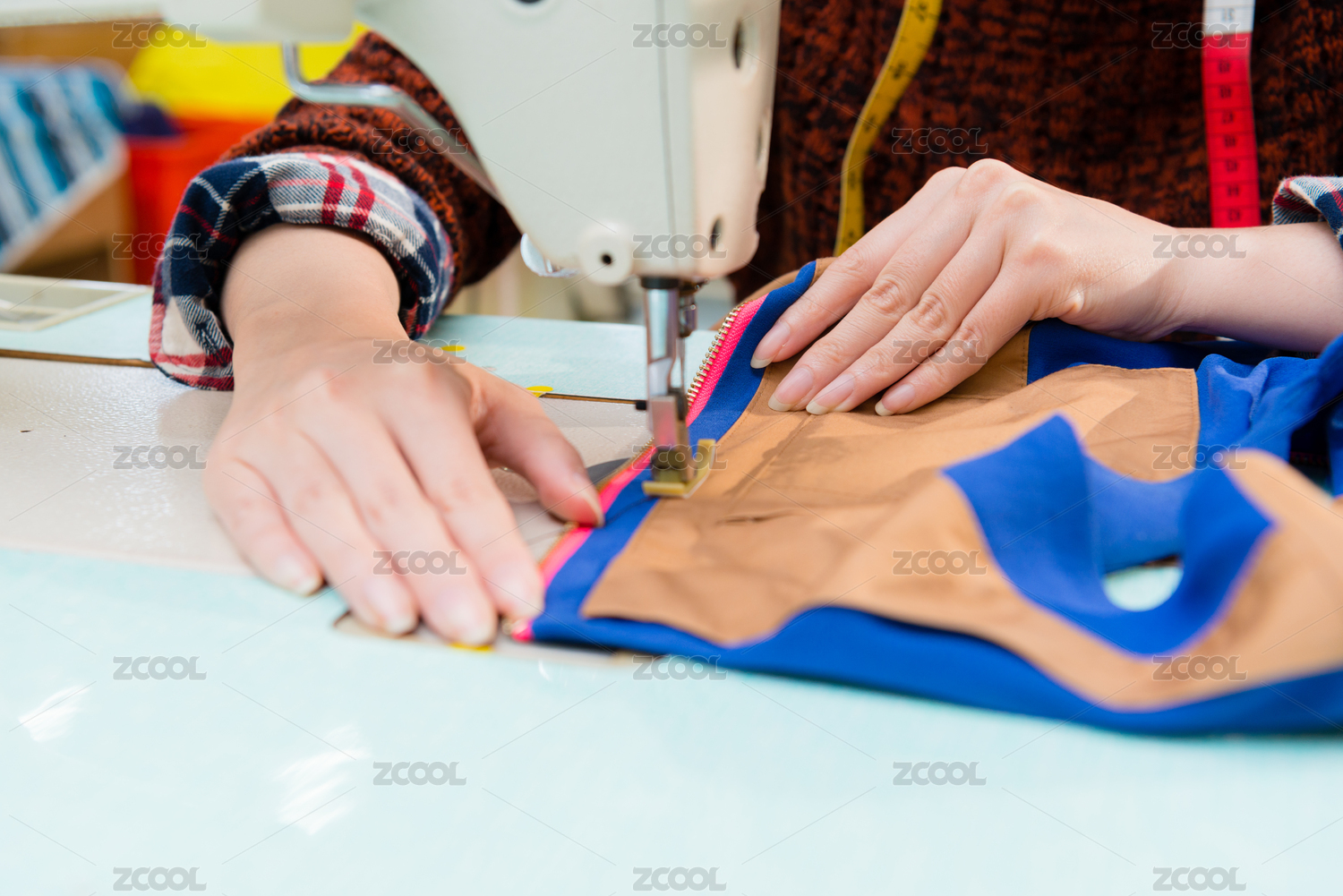 服裝廠員工的女子使用特制機(jī)器制造公司為新一季產(chǎn)品有選擇性的重點(diǎn)照片拿著禮服來樣特寫鏡頭。