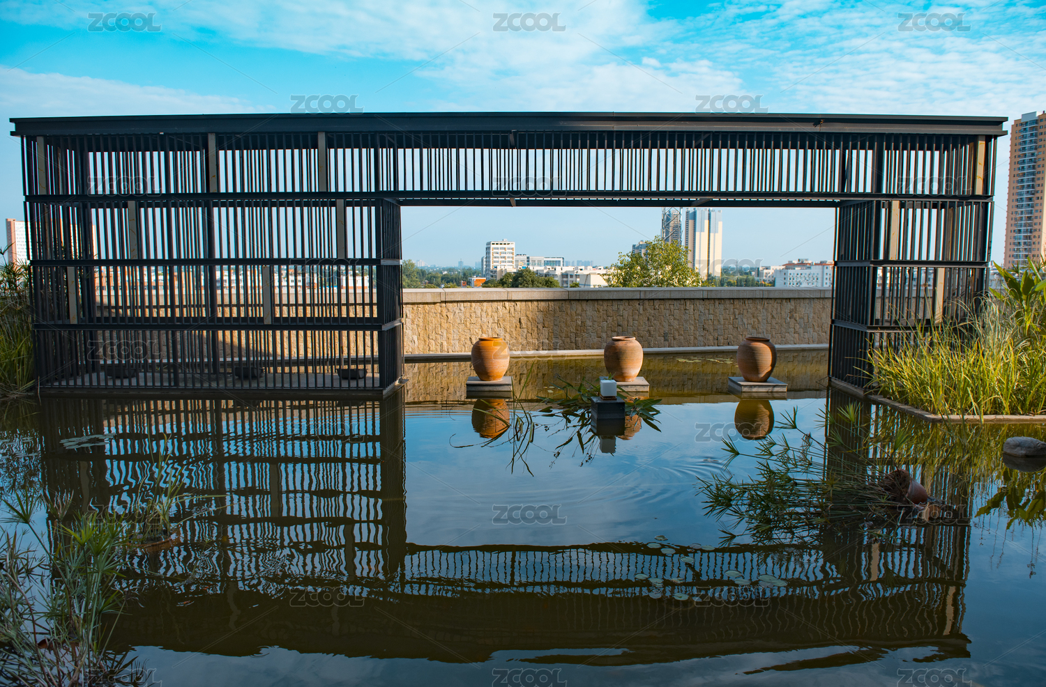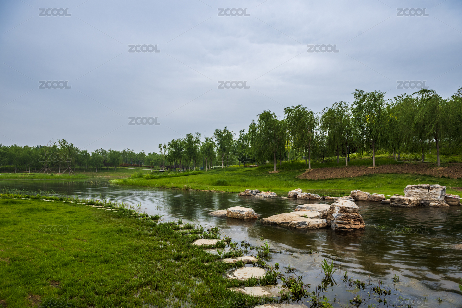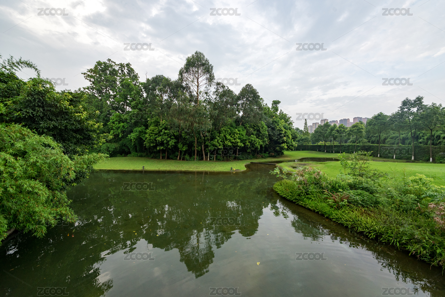中國(guó)北京城市綠心森林公園的運(yùn)河故道河岸綠草如