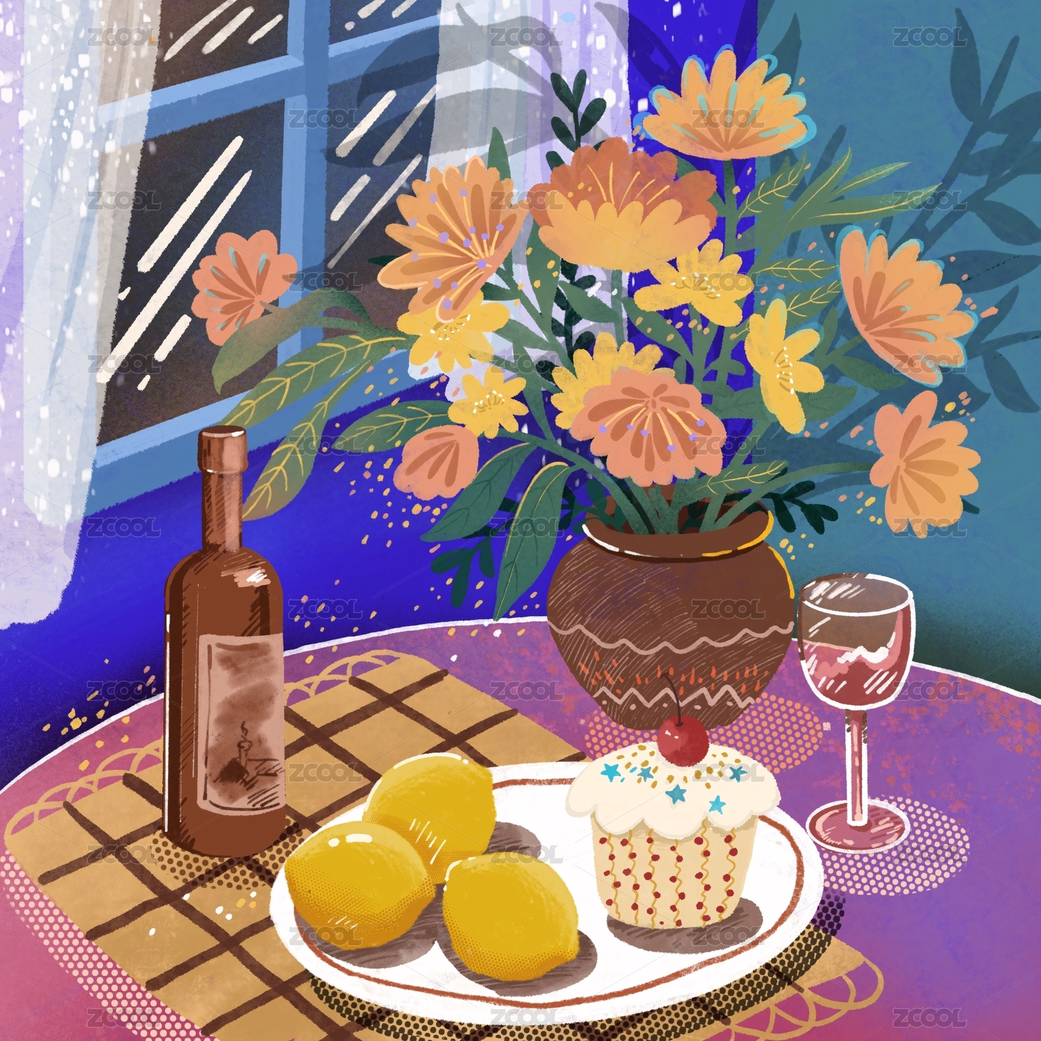 擺放著甜點(diǎn)花束紅酒的溫馨風(fēng)格桌面