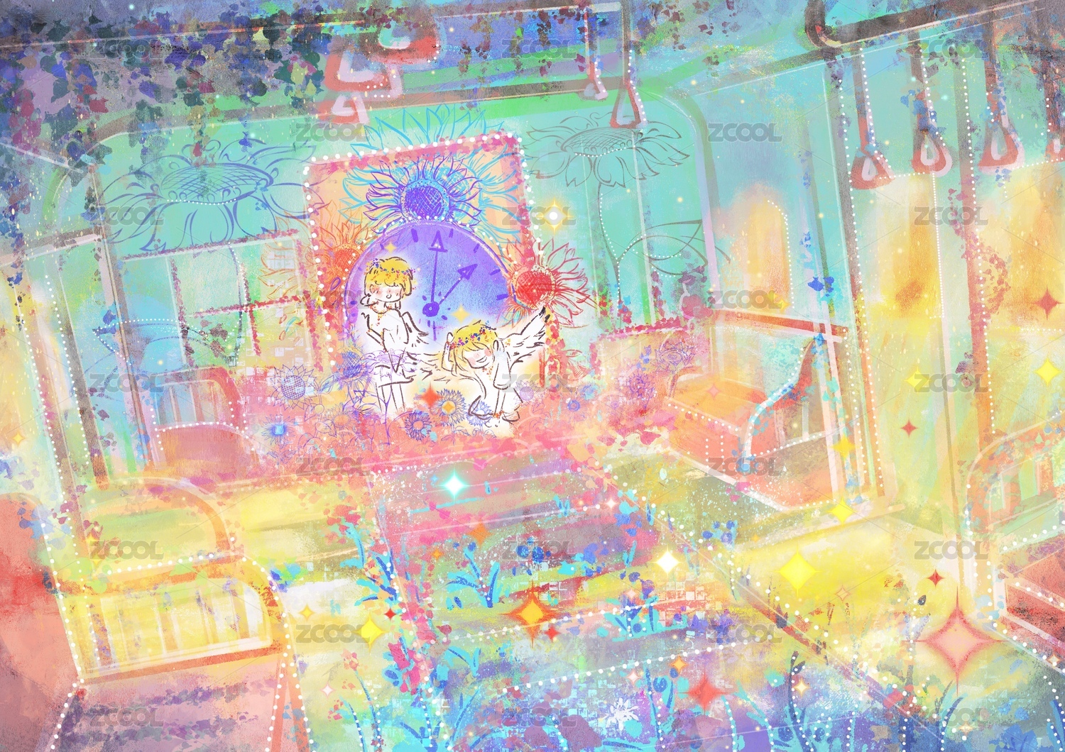 夢(mèng)幻氛圍巴士花園場(chǎng)景插畫(huà)