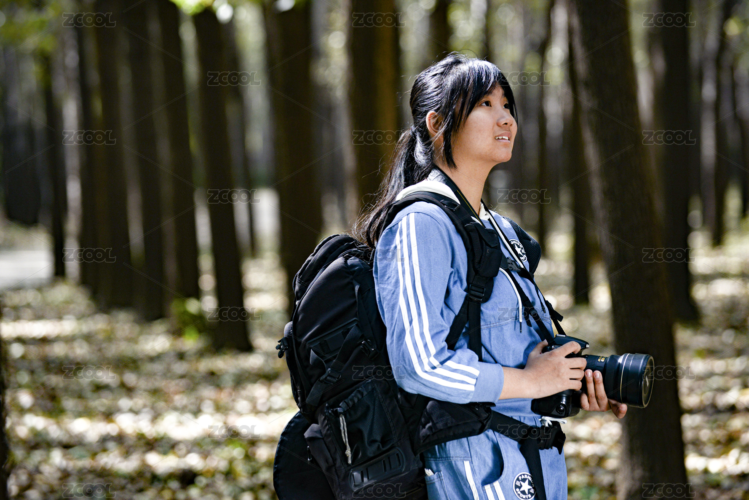 在戶外手持相機(jī)背著攝影包的美女
