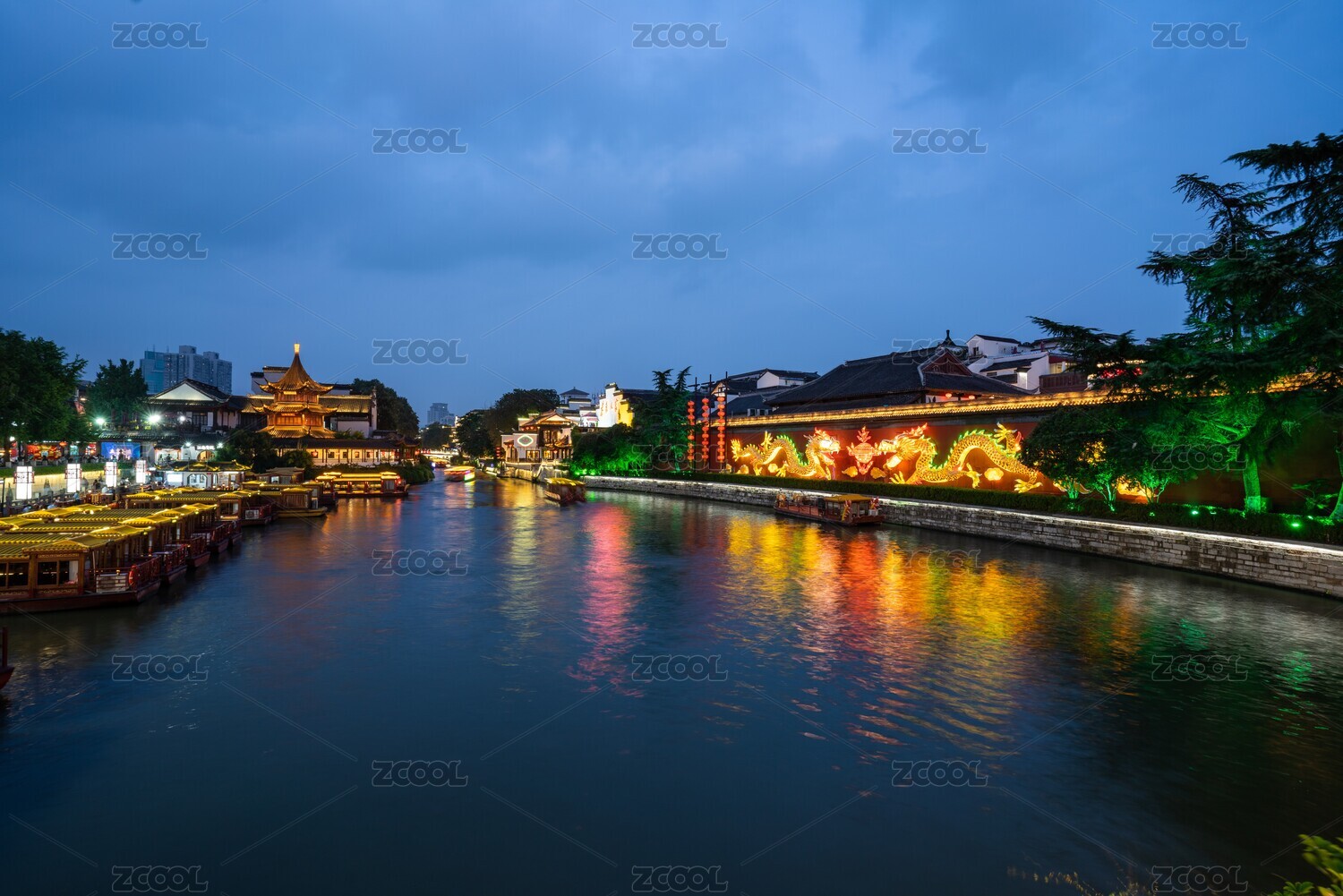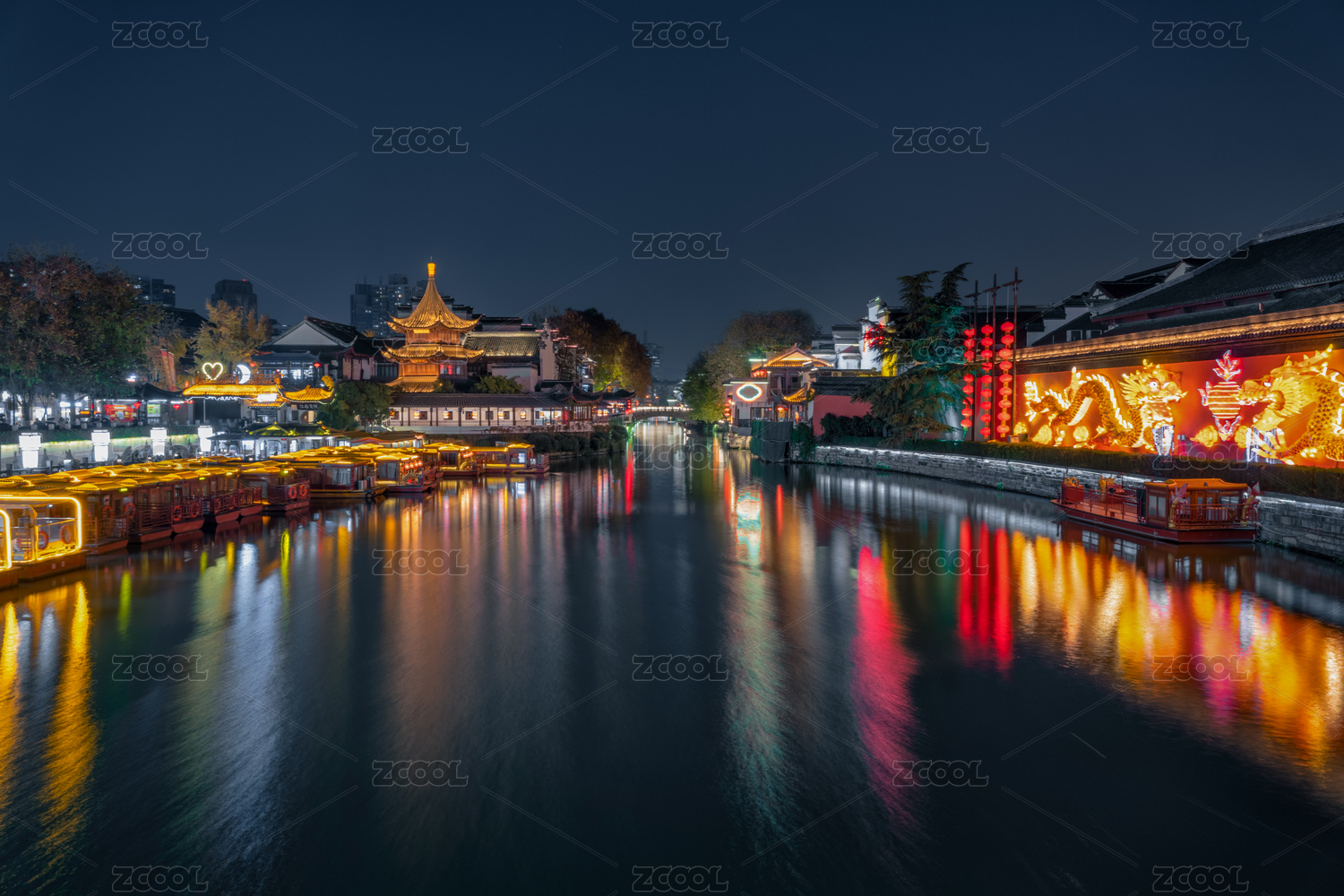 中國江蘇南京夫子廟秦淮河兩岸畫舫與游船夜景
