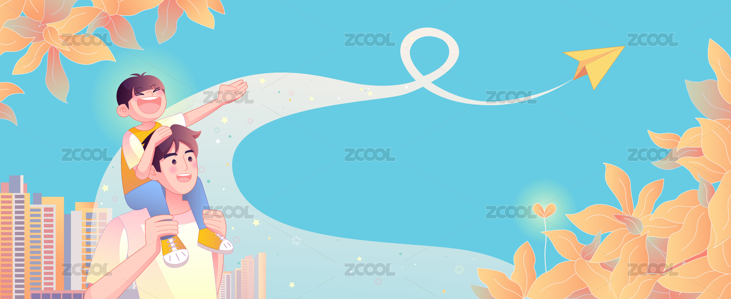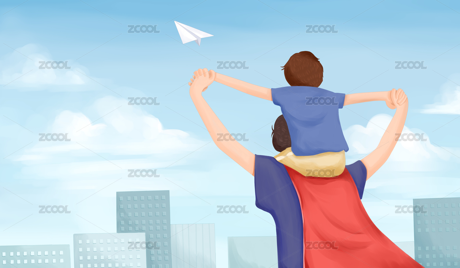 父親節(jié)插畫 兒子坐在披著超人披風(fēng)的爸爸肩膀上在城市上空放紙飛機(jī)手繪插圖 橫版無字體設(shè)計(jì)