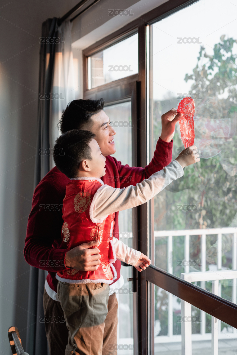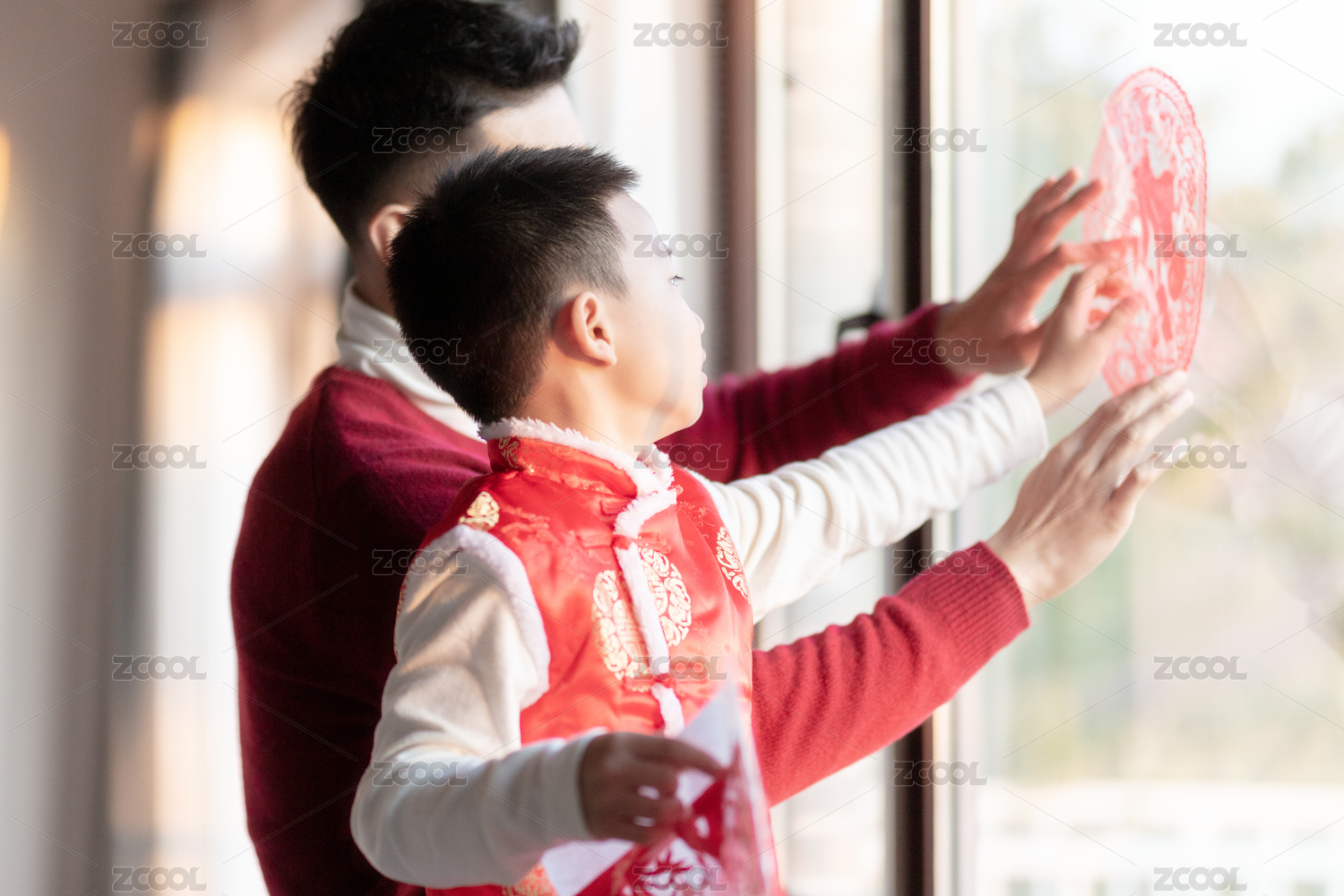 藍(lán)天城市植物下兒子坐在爸爸肩頭扔出紙飛機(jī)