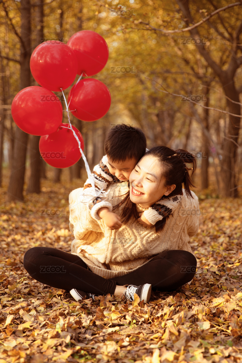 媽媽背著年幼的兒子幸福的坐在秋天的樹林里
