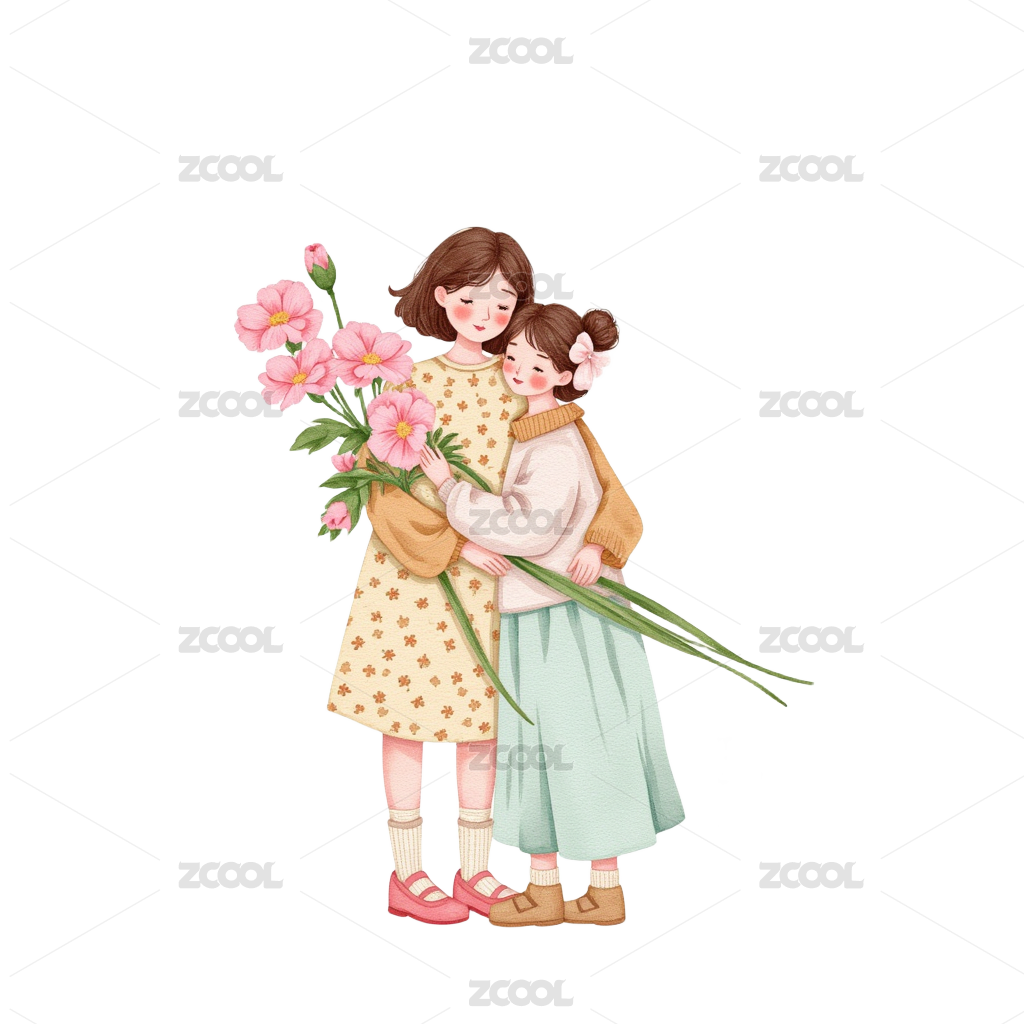母親節(jié)慈愛的媽媽擁抱女兒Png免摳素材水彩風(fēng)格