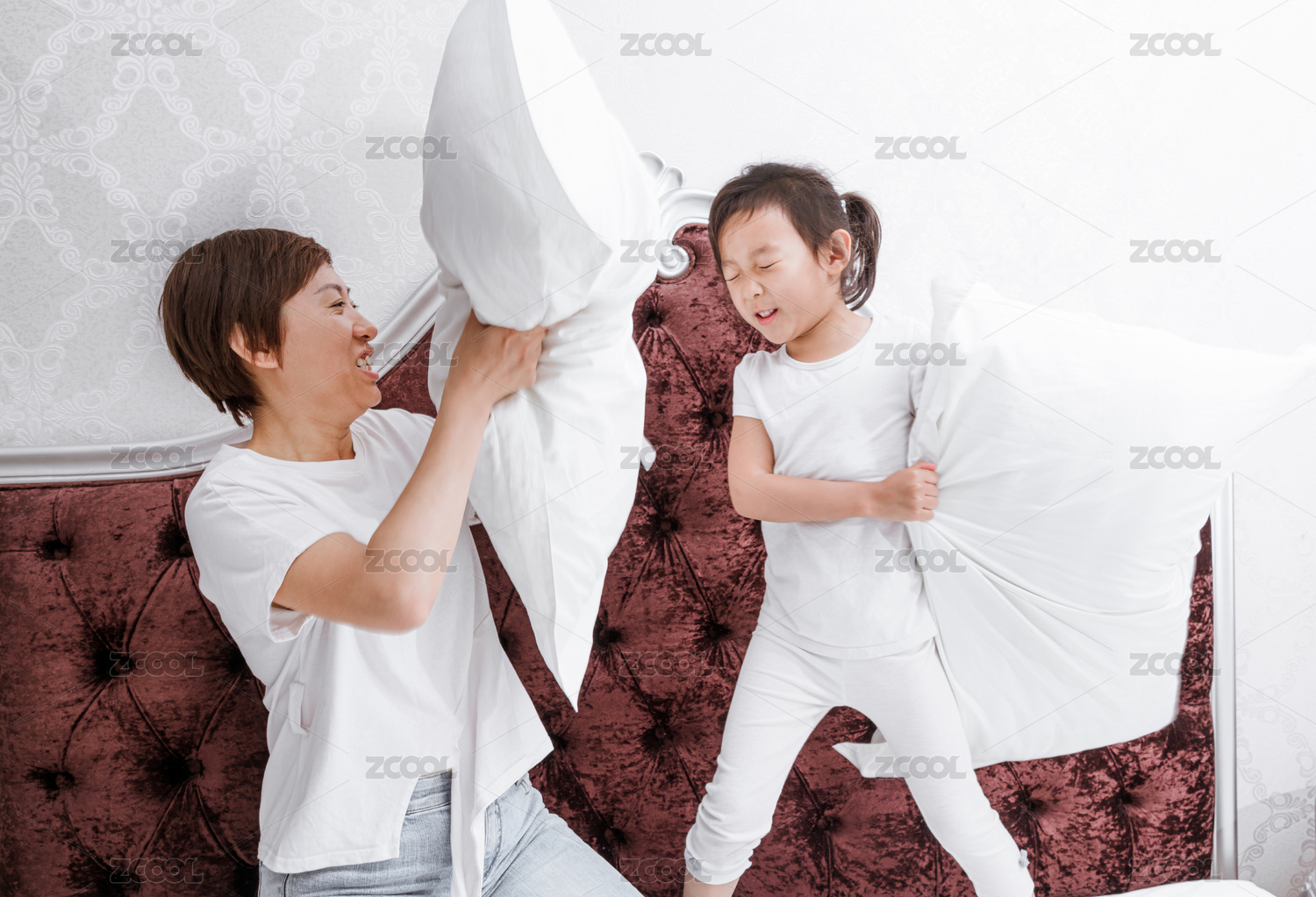 穿白色襯衣的母親和女兒站在床上用枕頭玩耍