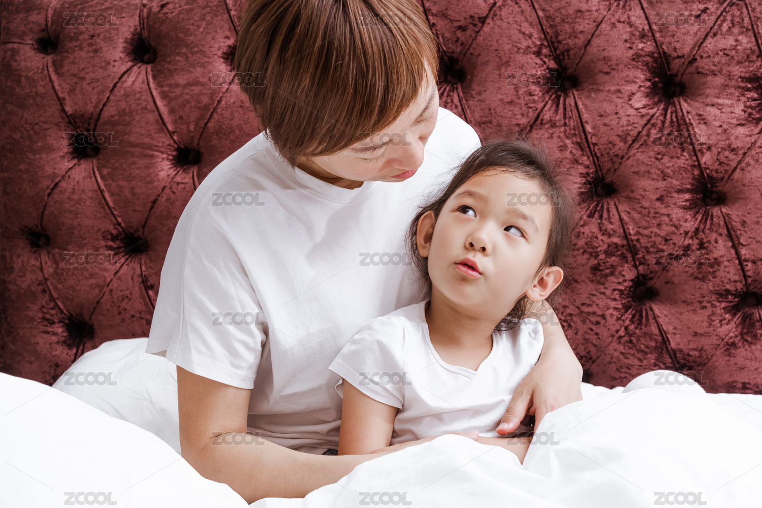 穿白色襯衣的母親與女兒坐在床上相擁對望