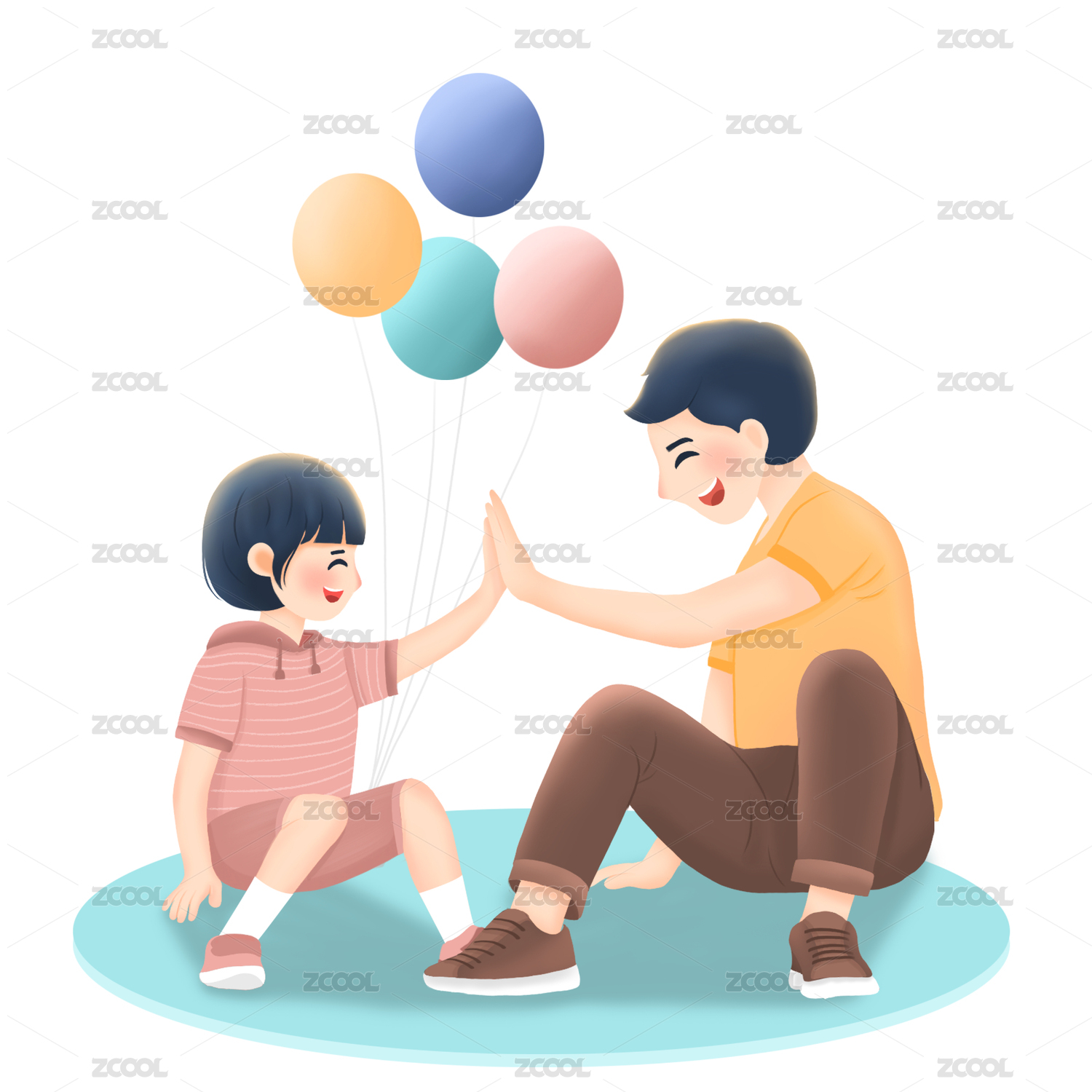 坐在氣球旁擊掌的父親與女兒插畫